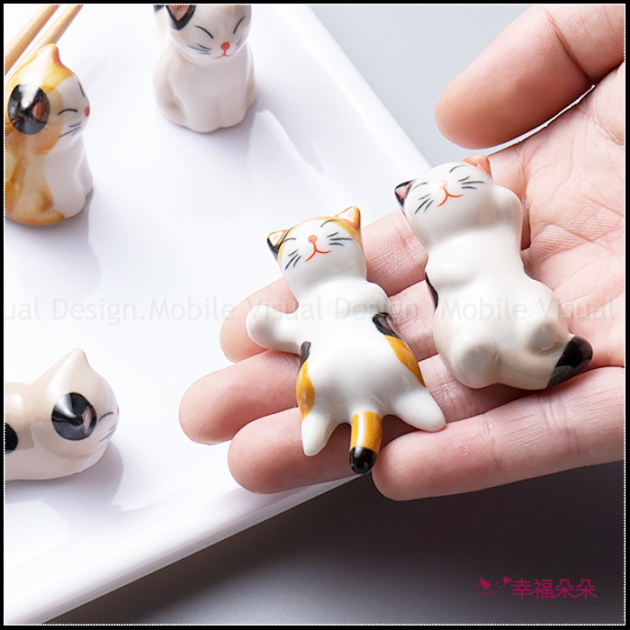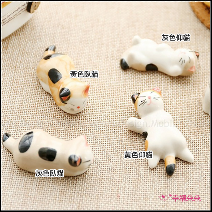 材質:陶瓷 工藝:釉下手彩 用途可做筷架、毛筆架 共有4款可挑:灰色仰貓、灰色臥貓、黃色仰貓、黃色臥貓。