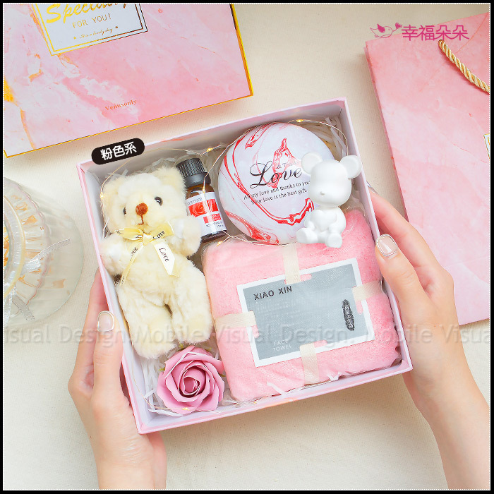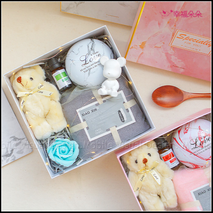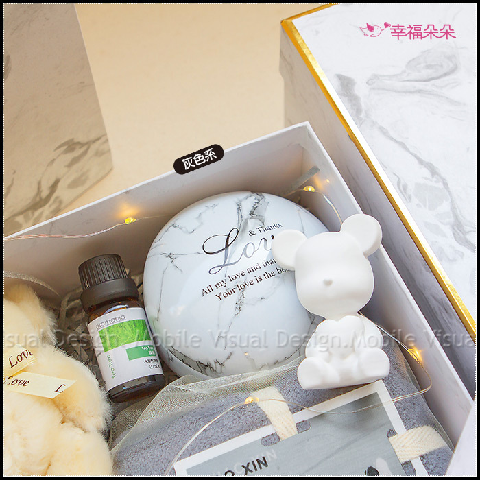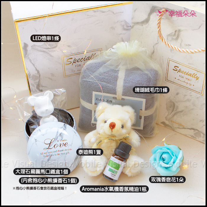內容物: 13cm泰迪熊X1 大理石扁圓馬口鐵盒X1(內含抱心小熊擴香石X1) Aromania水氧機香氛精油X1 珊瑚絨毛巾X1 裝飾玫瑰香皂花X1 1米LED燈串X1 附贈紙袋X1