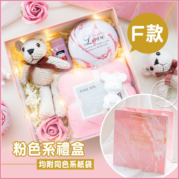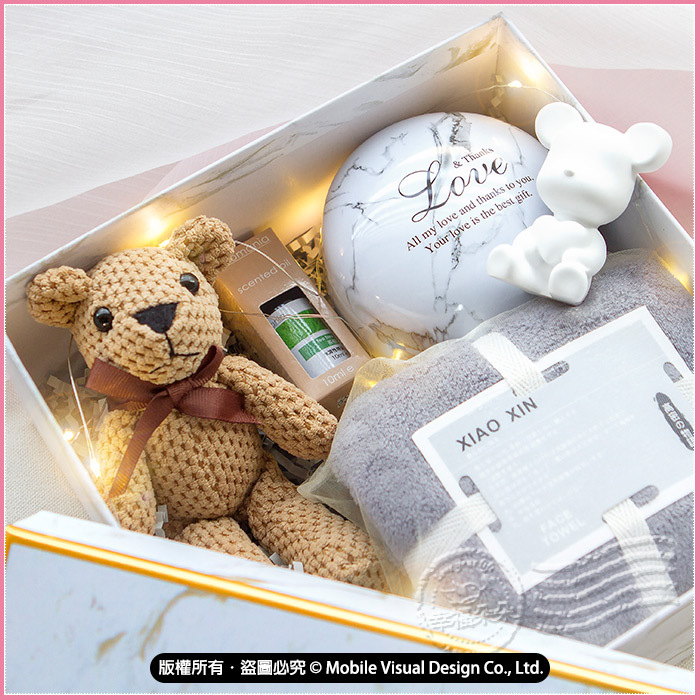 大理石質感禮盒設計,附贈提袋,內含毛巾、抱心小熊造型擴香石、格紋小熊娃娃、香氛精油與玫瑰香皂花,實用又浪漫,送禮自用兩相宜🎁 簡約又時尚,並附贈專屬提袋,送禮體面大方💝 無論是生日、節日、婚禮或日常心意,都能展現用心💕 ୨୧ 豐富實用內容物 ୨୧ 珊瑚絨毛巾 1條|柔軟親膚,實用度高。 格紋小熊娃娃 1隻|可愛療癒,增添溫馨氛圍。 大理石圓馬口鐵盒 1個(內含擴香抱心熊 1隻)|香氛持久,營造浪漫居家空間。 Aromania香氛精油 (茶樹或玫瑰香味)|搭配擴香石使用,散發淡雅清香。 裝飾玫瑰香皂花 1朵|美觀又實用,可當香氛或擺設。 LED燈串 1條|夜晚點亮,增添氛圍感。 ୨୧ 兩種色系可挑 ୨୧ 典雅灰色系:沉穩大方,質感首選。 浪漫粉色系:溫柔甜美,最適合表達心意。 (附贈同色系紙袋 1個) ୨୧ 適用場合 ୨୧ ✔ 生日禮物 ✔ 婚禮小物 ✔ 情人節禮物 ✔ 畢業禮品 ✔ 公司伴手禮