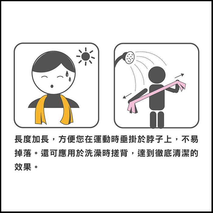 長度加長,方便您在運動時垂掛於脖子上,不易掉落。 還可應用於洗澡時搓背,達到徹底清潔的效果。