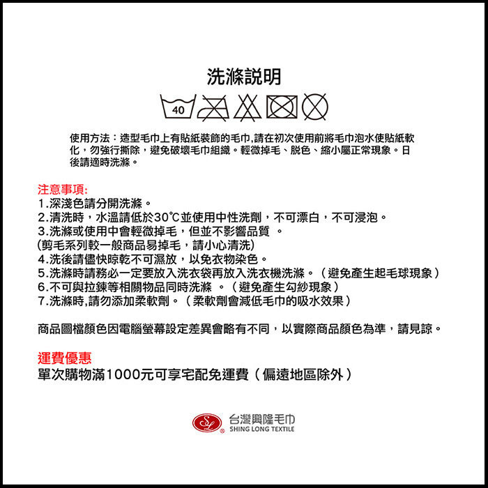 洗滌小貼士 毛巾類產品屬於貼身私用衣物,建議與其他衣物分開清洗, 洗後懸掛晾乾放置於通風陰涼處即可。 毛巾類產品盡量選擇用手洗較不易起球掉毛喔:)