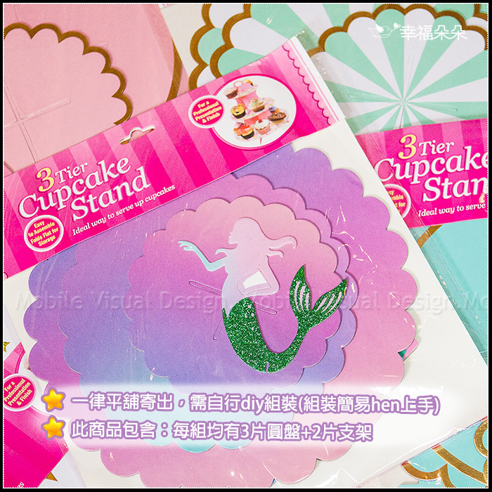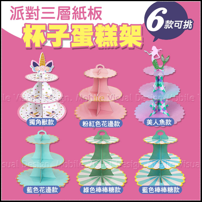 杯子蛋糕架共有6款可挑: 獨角獸款、美人魚款、藍色花邊款、 粉紅色花邊款、綠色棒棒糖款、 藍色棒棒糖款!