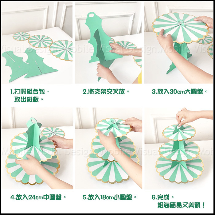 注意事項: 使用前請先確認是否組裝完成,以避免使用上蛋糕架傾斜不穩倒塌。擺放物品時請斟酌物品重量(點心、小蛋糕是OK的喔!)