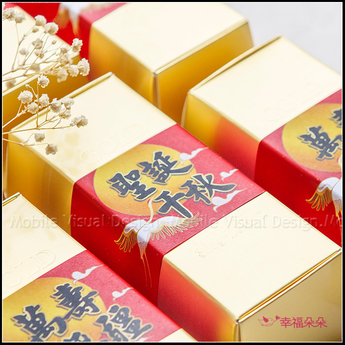 腰封共有2款可挑:聖誕千秋、萬壽無疆。 腰封均以丹頂鶴飛月為主題設計,亦寓意著福祿安康、圓滿吉祥、健康長壽,在古代民間更是羽族動物之首,也可象徵指日高升! 是相當有含意的小禮物喔! 滿百份皆可客製文字(如圖5,文字愈多字體愈小喔!!)