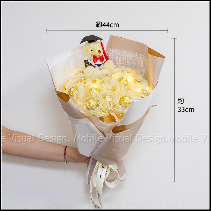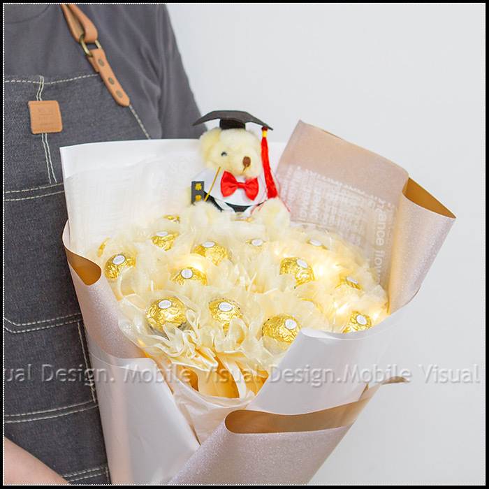 ✿✿✿ 每束均有 18支金莎巧克力花棒 + 1隻畢業小熊 並附1條一米長的LED銅線燈串 (有開關並附CR2032鈕扣電池) ! 讓你的禮物更加shiny shiny💖💖💖 (若遇紙材缺貨或斷貨,將以類同色他款替代)