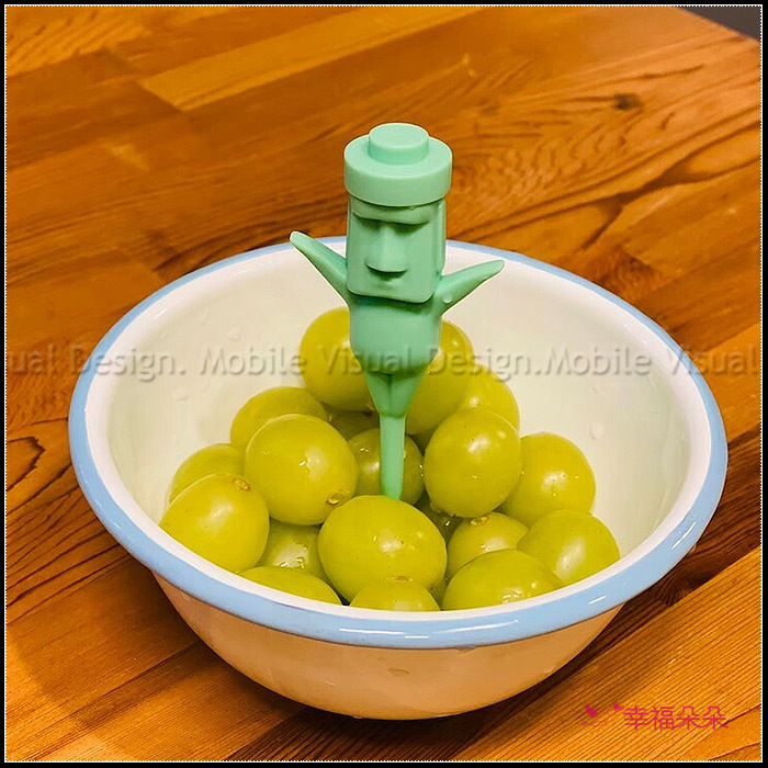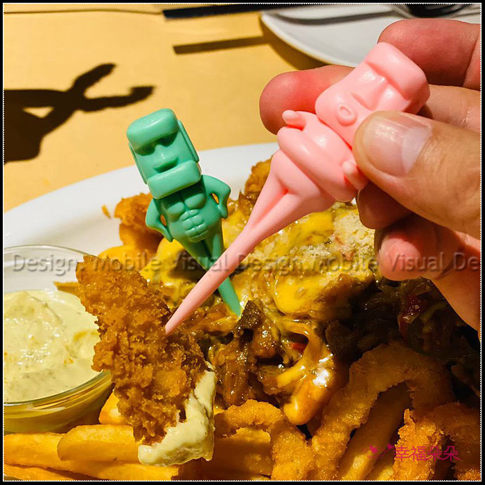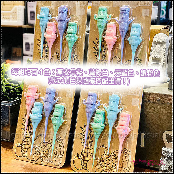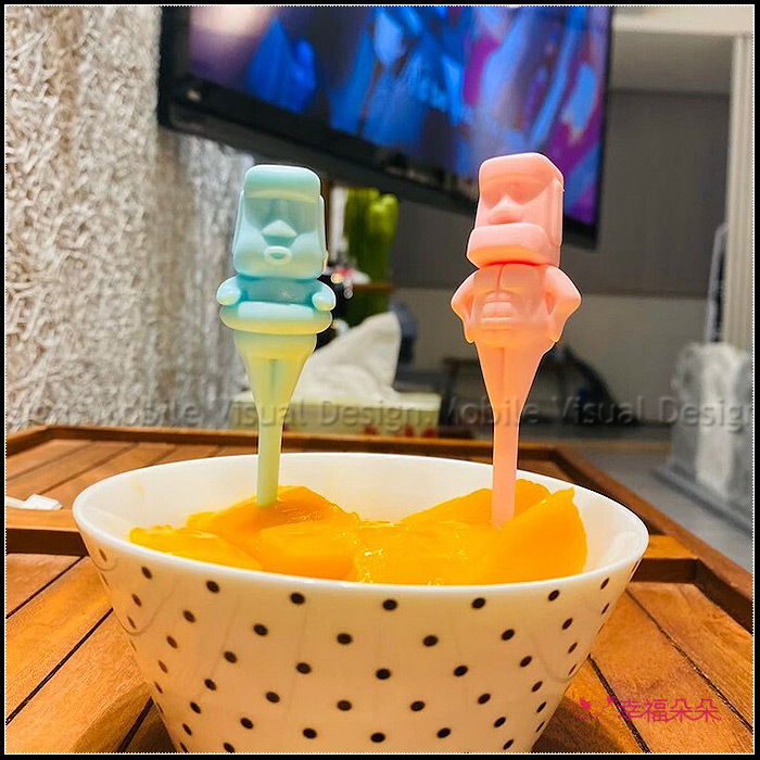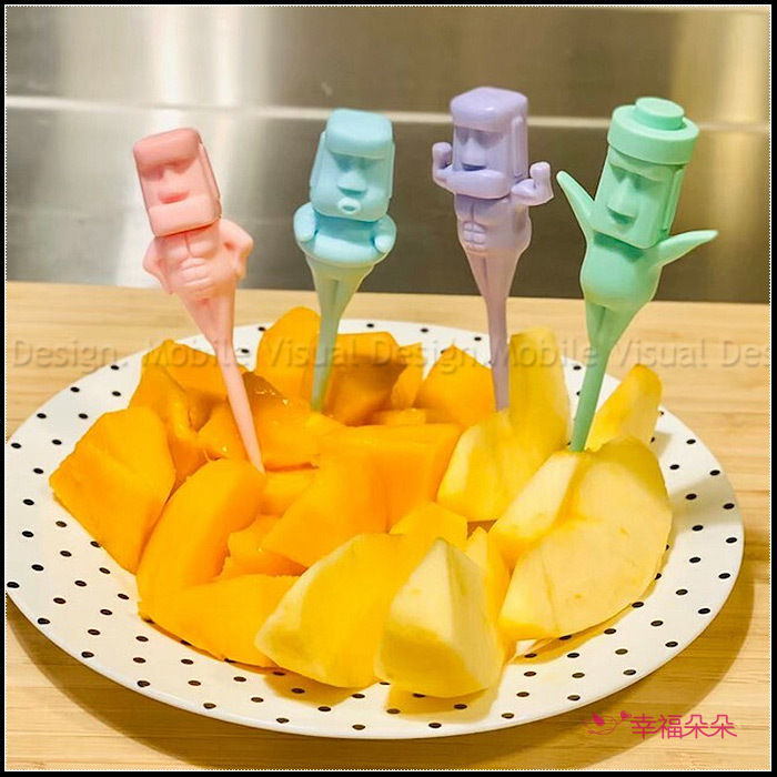 繽紛色系的摩艾石像水果點心叉讓美食更添加了甜蜜氛圍🥰 動作活潑可愛,療癒極了🤤 自己用的開心~ 朋友作客拜訪也看得開心🤣 使用在水果、小蛋糕、點心、漢堡上都很適合唷~~!!