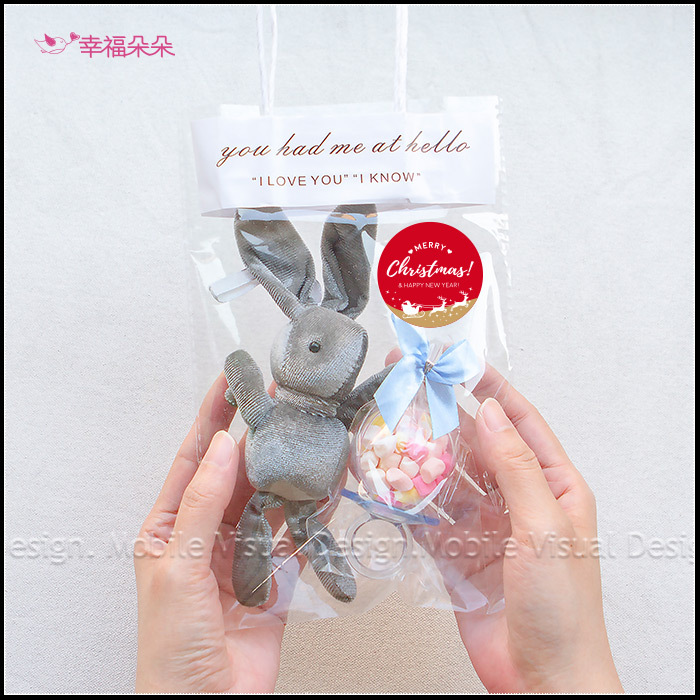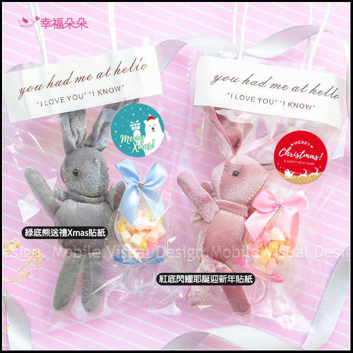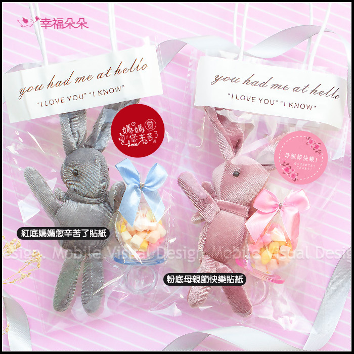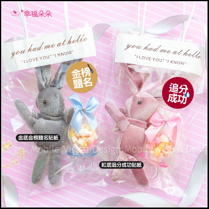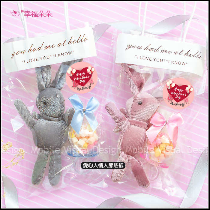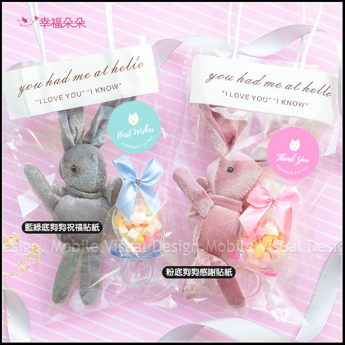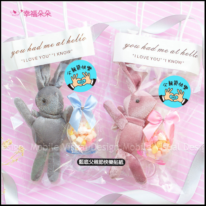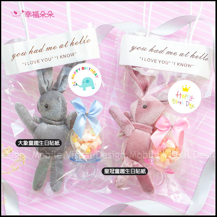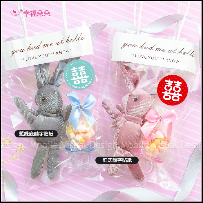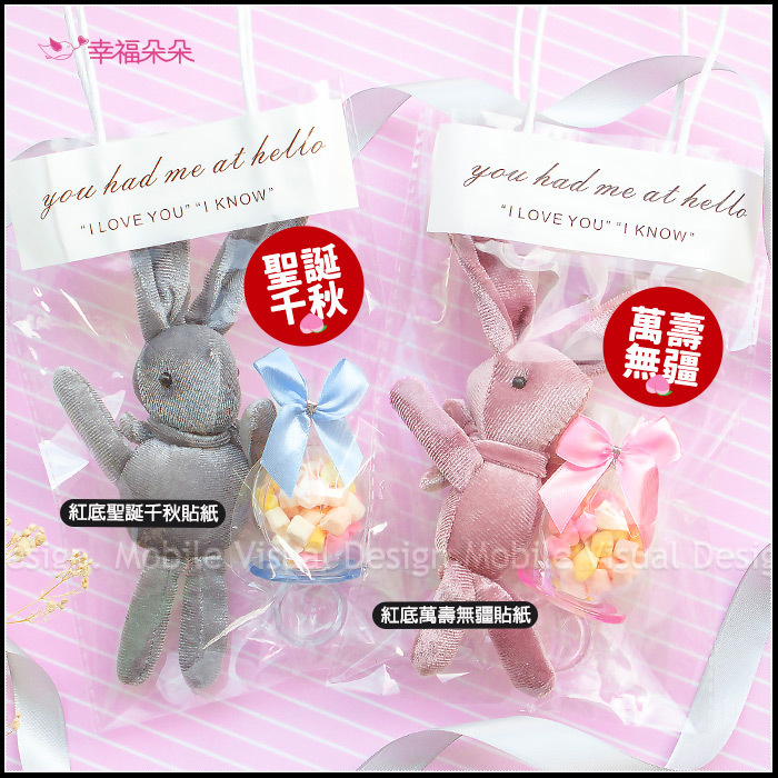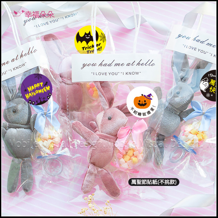 🧡每組小禮袋均有1隻許願兔娃娃掛飾 + 1個戒指奶嘴粉彩棉花糖 每組小禮袋右上方皆會貼有幸福朵朵獨家設計4cm圓貼紙,非常俏皮可愛喔! 拿來作為婚禮小物、生日分享、情人節禮物、畢業季等,活動送朋友都hen棒喲👍
