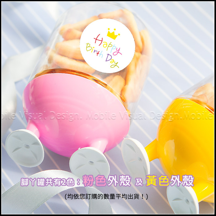腳丫罐共有2色:粉色外殼及黃色外殼 ※腳ㄚ罐外殼顏色均依您訂購的數量平均出貨!若您只訂1罐者均以粉色外殼出貨!