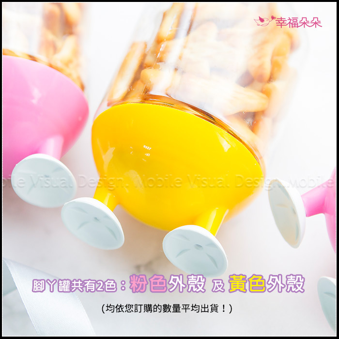 腳丫罐共有2色:粉色外殼及黃色外殼 ※腳ㄚ罐外殼顏色均依您訂購的數量平均出貨!若您只訂1罐者均以粉色外殼出貨!