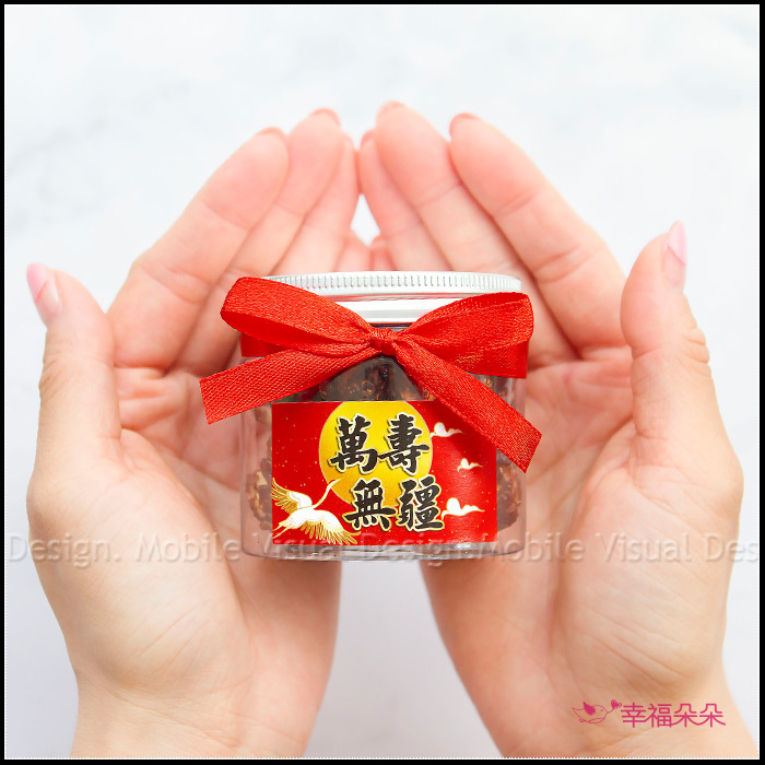🧡每罐都貼有幸福朵朵獨家設計貼紙,並為您繫上亮紅色素面緞帶,非常俏皮可愛喔!拿來神明祝壽做供品都很棒喔🧡