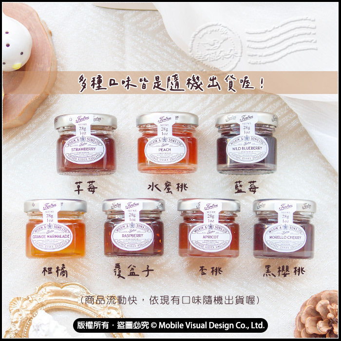 *果醬口味8種皆採現貨隨機口味出貨喔:草莓 、覆盆子、黑櫻桃、黑醋粟、柑橘、杏桃、水蜜桃、藍莓(商品流動快,依現有口味隨機出貨喔)