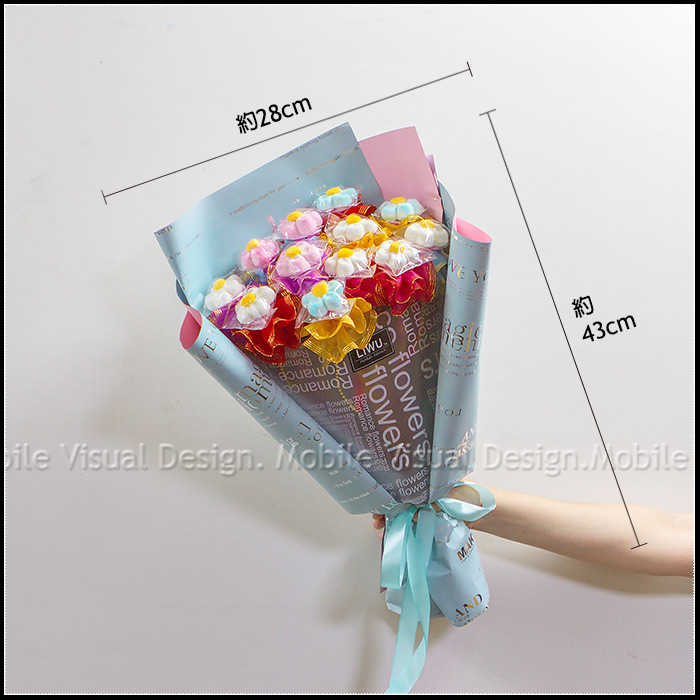 總寬約28cm,總高約43cm (因該花束為手工製作,每束花束體積大小難免會有誤差喔!)