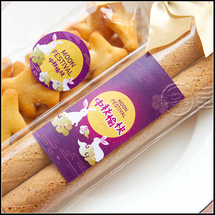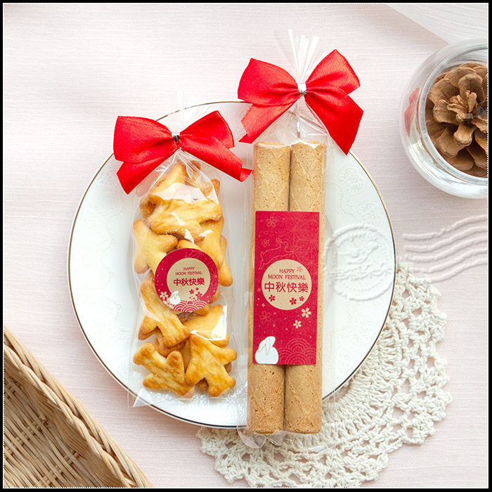 共有2款可選:紅底玉兔望月-中秋快樂(搭大紅色蝴蝶結)、紫底月圓雲兔-中秋愉快(搭金色蝴蝶結)