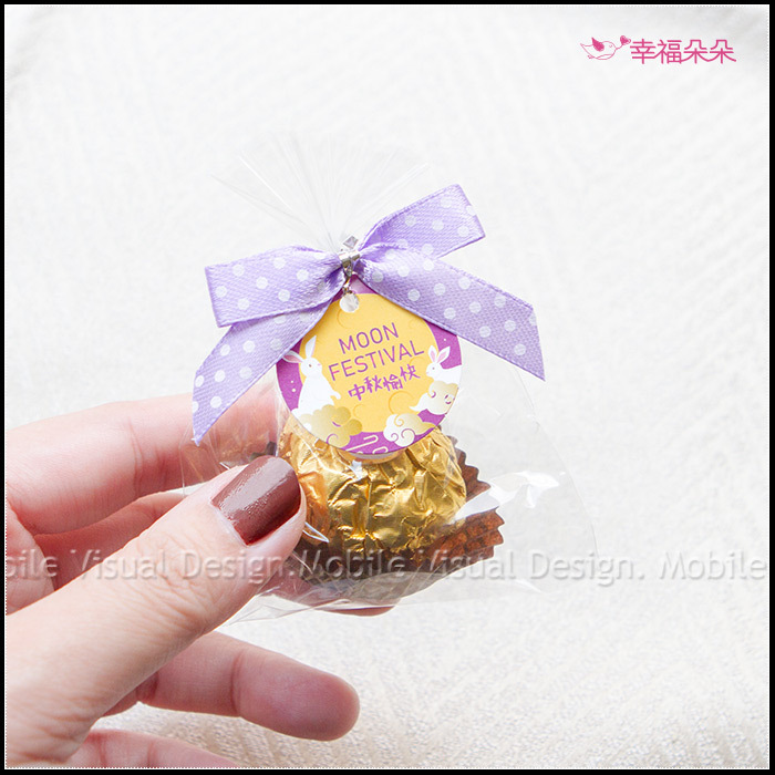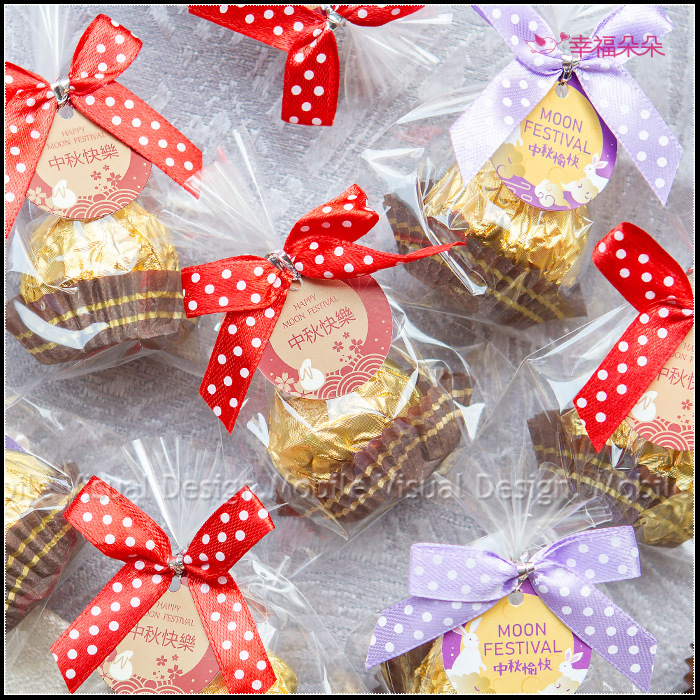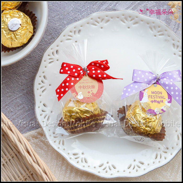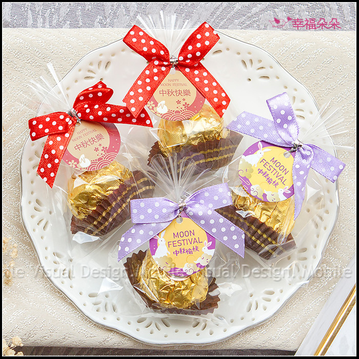 每份精巧包均有 金莎巧克力1顆入並會為您繫上水玉蝴蝶結及3cm圓形吊牌 共有2款可挑:紅底玉兔望月-中秋快樂、紫底月圓雲兔-中秋愉快🧡 作為節日送禮或拜訪客戶都絕對是超棒的禮物喔。 保存方式:存放於乾燥陰涼處即可 保存期限:至少半年以上