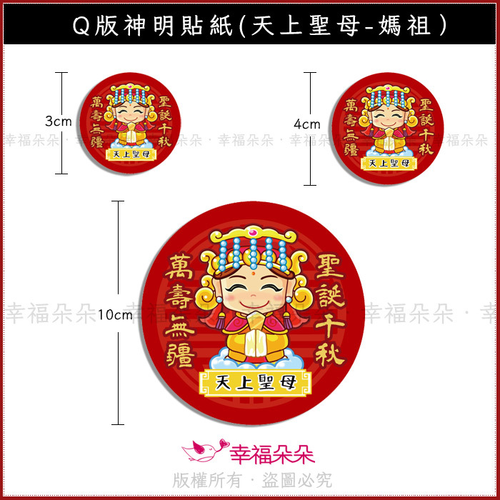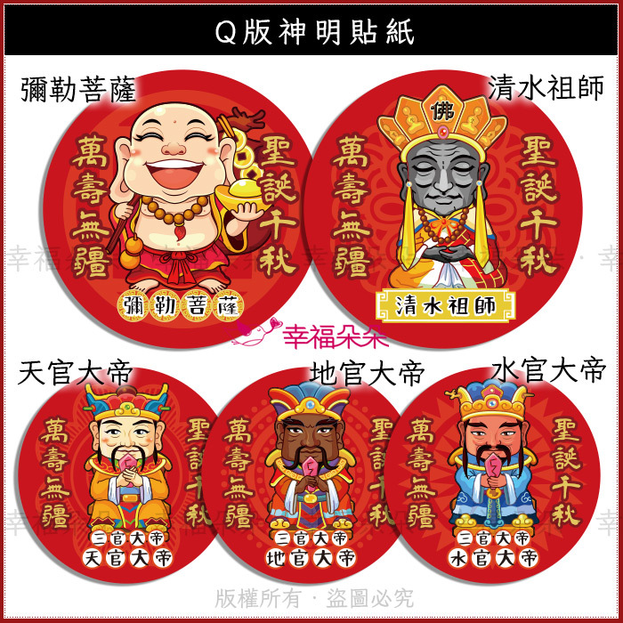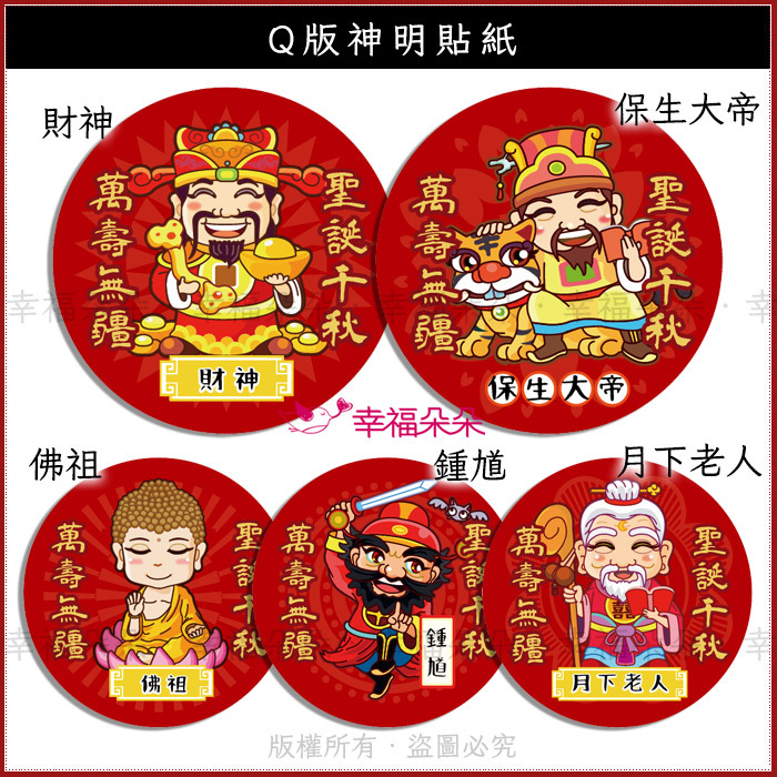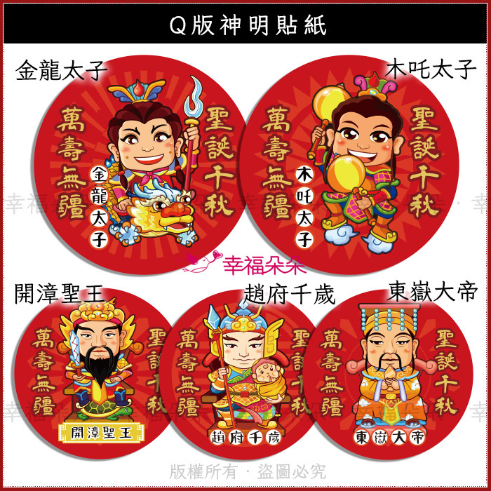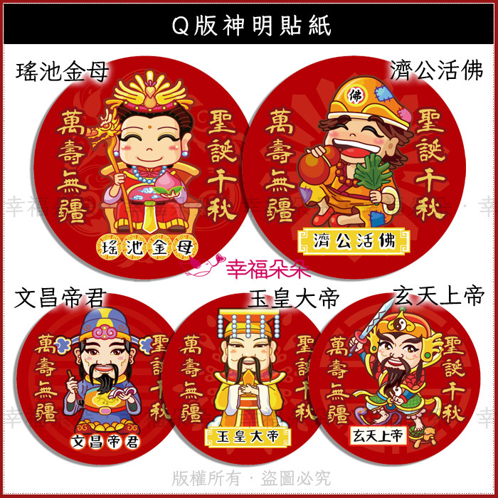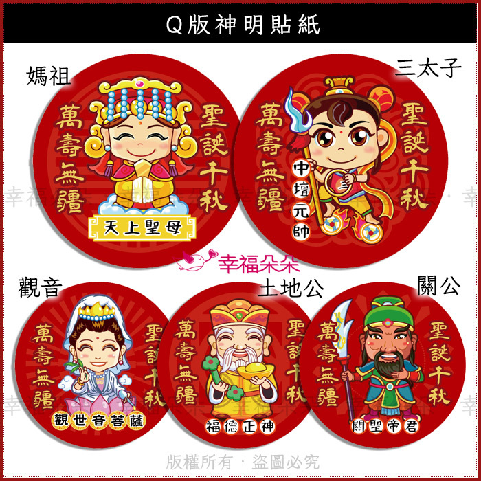 | 商品名稱 | 幸福朵朵 Q版神明貼紙 神明祝壽貼紙 拜拜貼紙 神像貼紙 媽祖 三太子 王母娘娘 關公 財神 聖誕千秋 萬壽無疆 可自取 (新品上市特價中) |