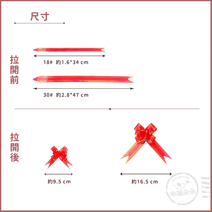 18#,成型前寬1.6X34cm(成型後拉花寬約9.5cm) 30#,成型前寬2.8X47cm(成型後拉花寬約16.5cm) |