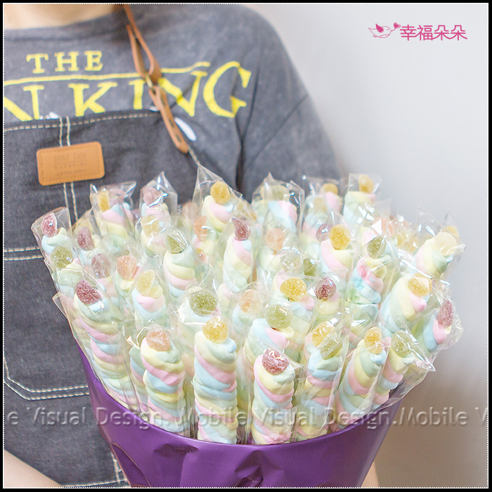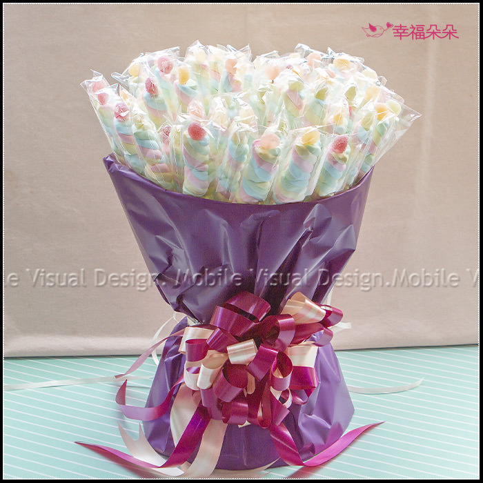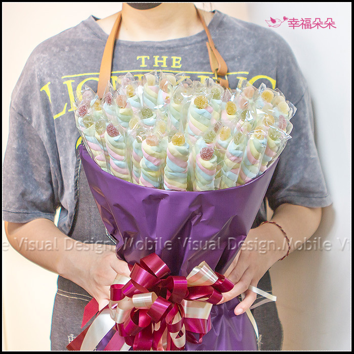 抽取式花束-QQ軟糖+麻花捲棉花糖串X100支+花束底籃(紫)X1個(限宅配) (新品上市特價中)