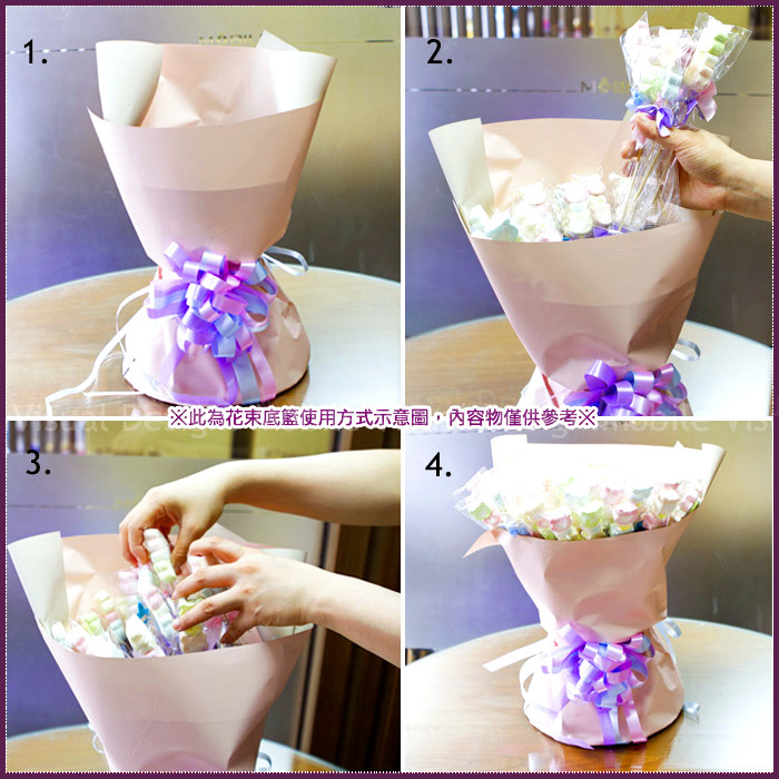 每組均附有: QQ軟糖+麻花捲棉花糖串X100支 + 附贈「獨家設計」花束底籃1個 需自行將棉花糖放入提籃,效果即可像圖1一樣,可抱著進場,亦可放在禮桌上做裝飾佈置喔😘