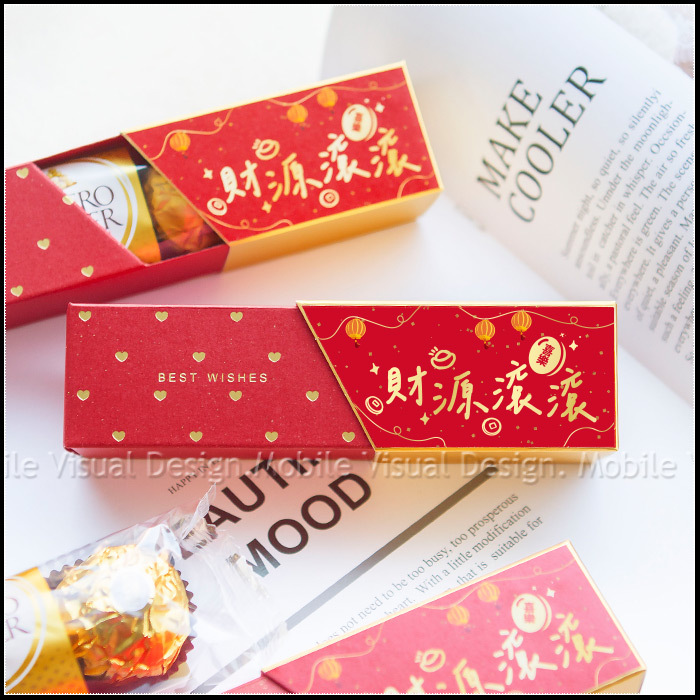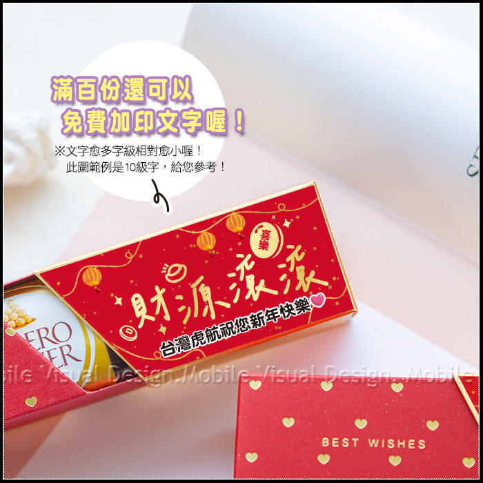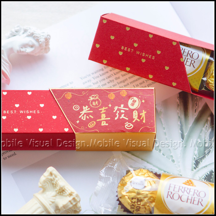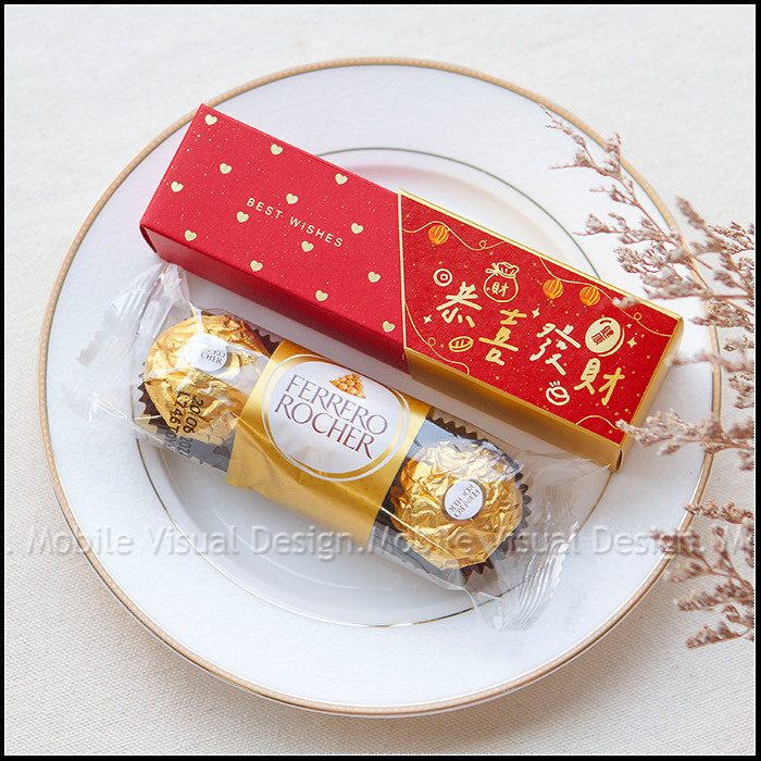 每個包裝盒內均有 金莎巧克力3顆入 ,外盒並貼有幸福朵朵獨家設計貼紙,非常典雅活潑!作為節日送禮或拜訪客戶都絕對是超棒的小禮物喔🧡 貼紙共2款可挑:恭喜發財款、財源滾滾款