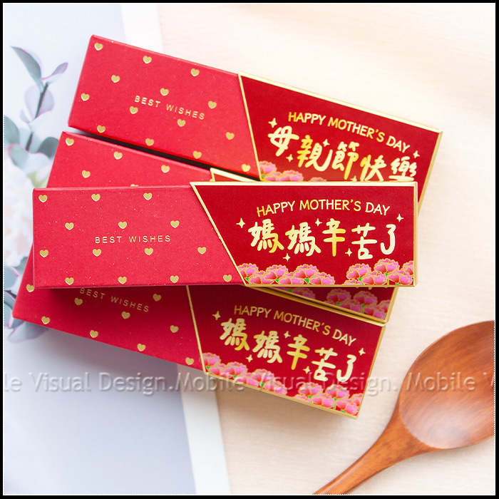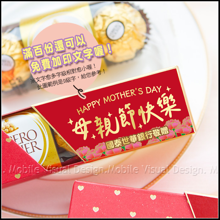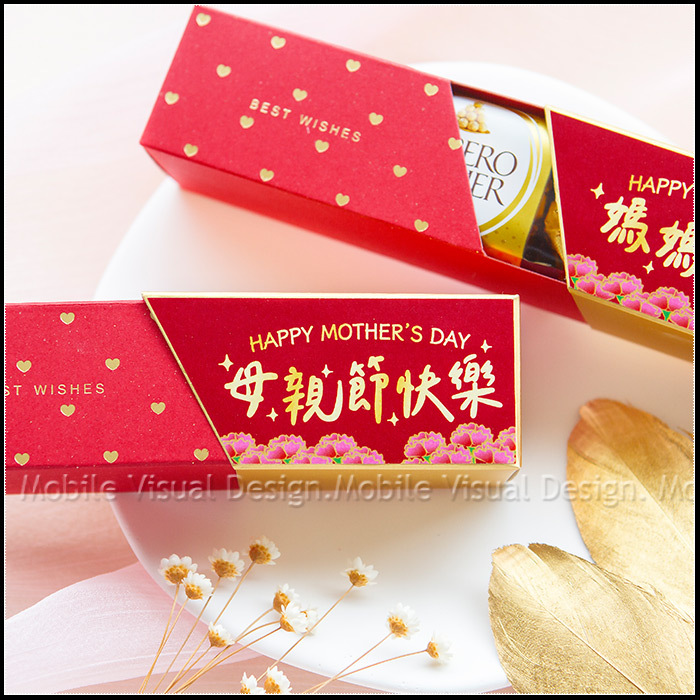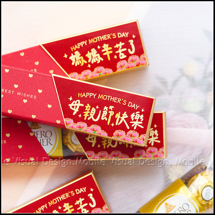 每個包裝盒內均有 金莎巧克力3顆入 ,外盒並貼有幸福朵朵獨家設計貼紙,非常典雅活潑!作為入厝分享送禮或拜訪客戶都絕對是超棒的小禮物喔🧡 貼紙共2款可挑:母親節快樂款、媽媽辛苦了款
