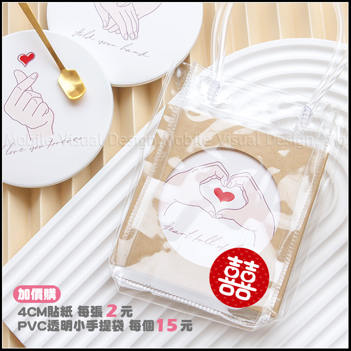 共有4款插畫可挑: ① 雙手合併比大愛心(文字:Heart full of love) ② 單手比小愛心(文字:I love you forever) ③ 十指緊扣 (文字:Love of my life) ④ 執子之手 (文字:Hold your hand) ※杯墊皆採台灣專業機台UV直噴精美印刷※ ※每份均有「紙盒」包裝,送禮大方又有質感※