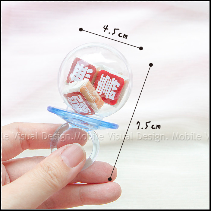每顆牛奶糖約1.8x1.8cm ; 每個戒指奶嘴瓶約直徑4.5cm圓 x 高7.5cm 內容物手工測量,多少會有些微誤差喔! 不介意才下訂