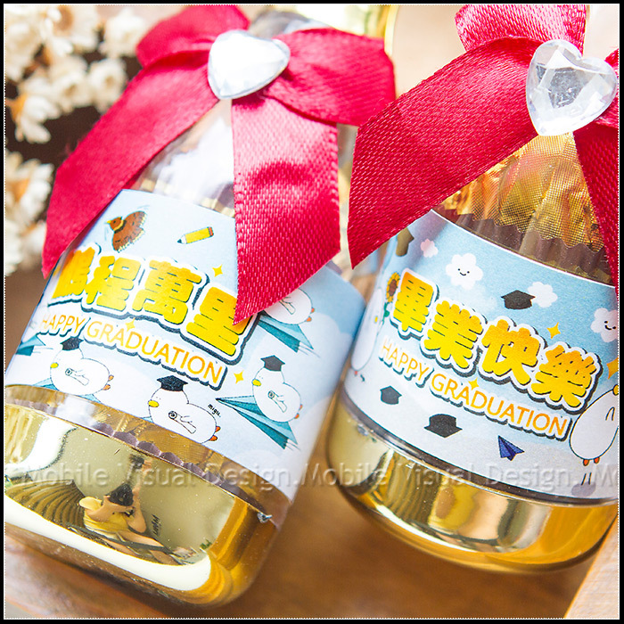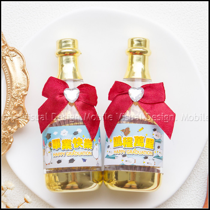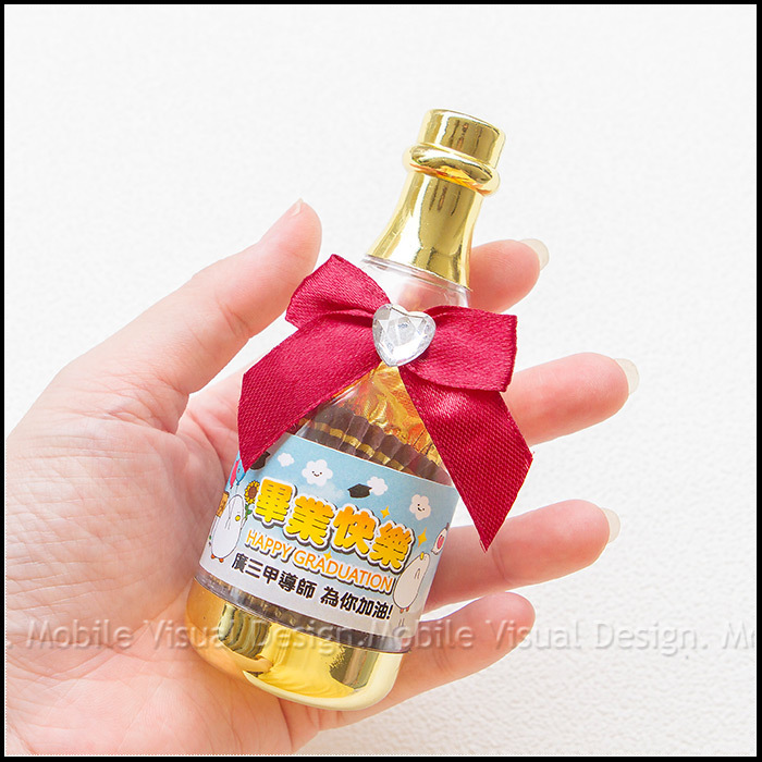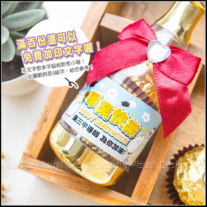 每瓶香檳瓶內均有 金莎巧克力2顆入 ,均會貼上da0_migu插畫聯名款設計畢業主題腰封,讓您的活動更加活潑可愛喔! 作為畢業禮物都絕對是超棒的禮物喔。