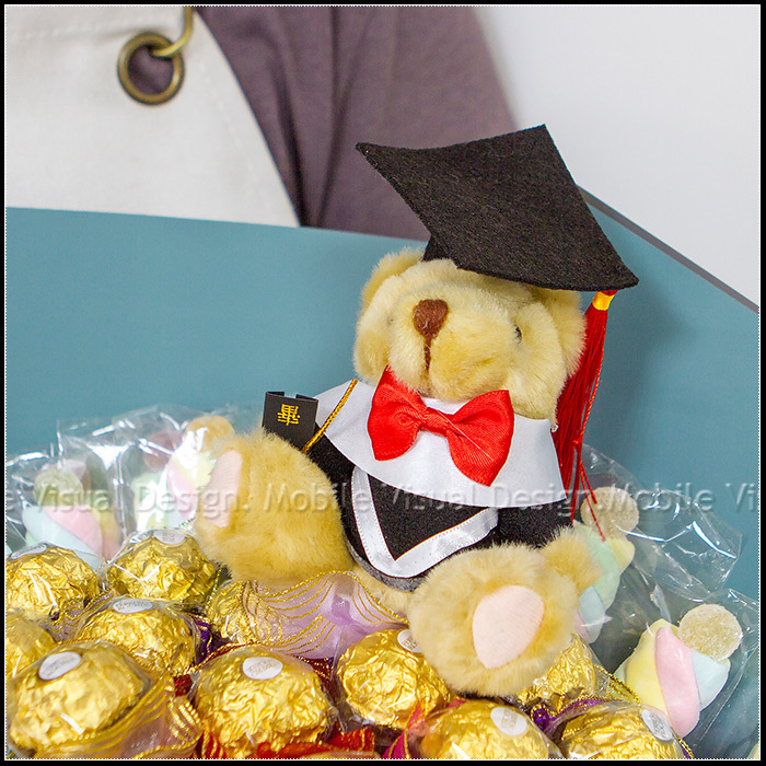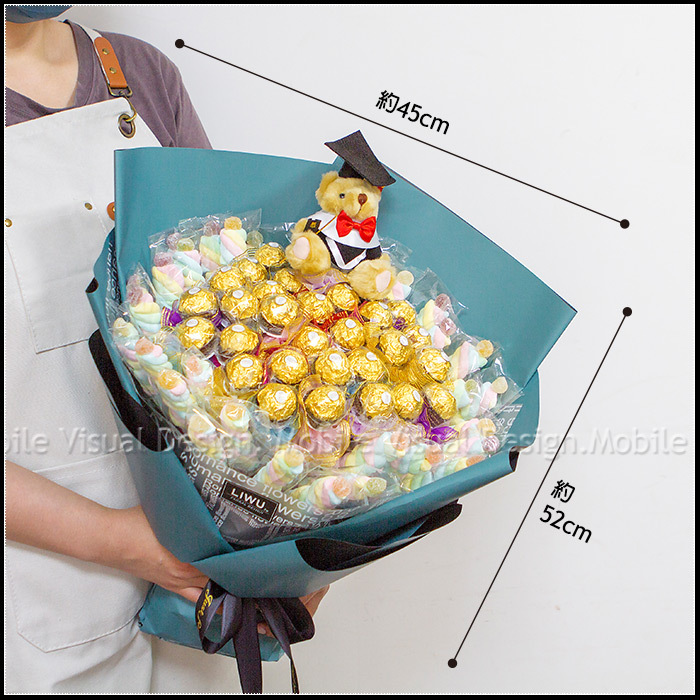 畢業花束 畢業熊+金莎30支+QQ軟糖麻花捲棉花糖30支 花束 (療癒藍) A017 (新品上市特價中)
