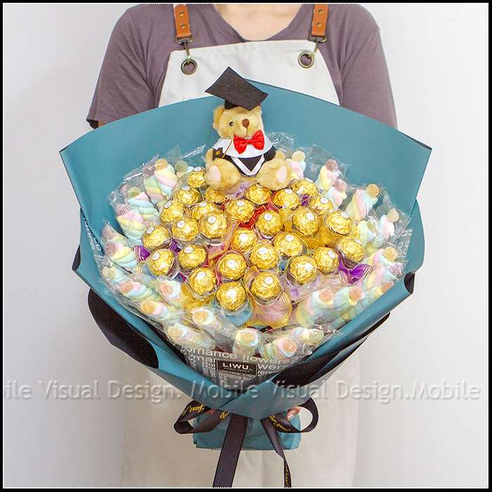 ✿✿✿ 每束均有 30支金莎巧克力花棒 + 30支QQ軟糖麻花捲棉花糖 + 1隻畢業小熊 (若遇紙材缺貨或斷貨,將以類同色他款替代)