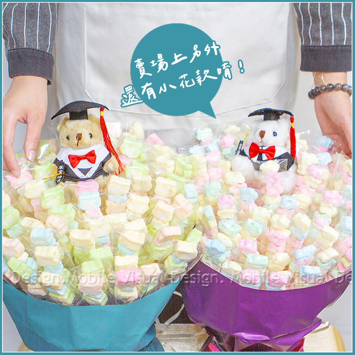 *此商品是由1支畢業小熊花棒 + 2顆小熊棉花糖 + 1顆小花棉花糖串起,全程採用乳膠手套製作,並使用熱封封口機連同竹籤整支封起,安全衛生👍