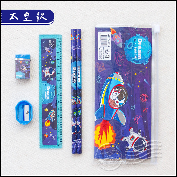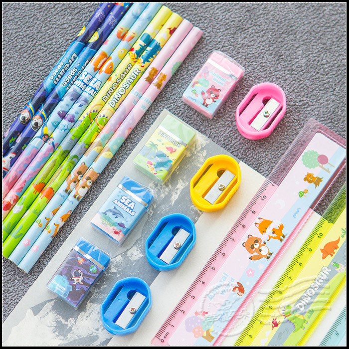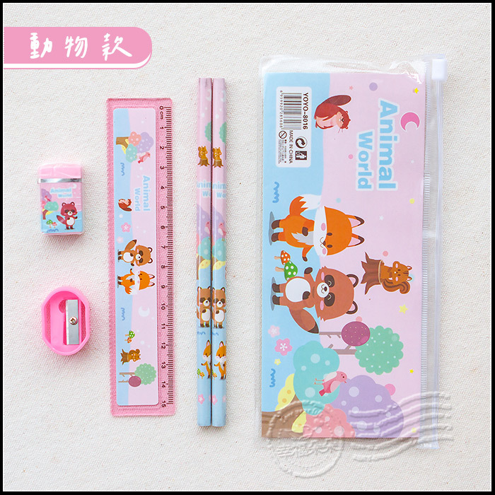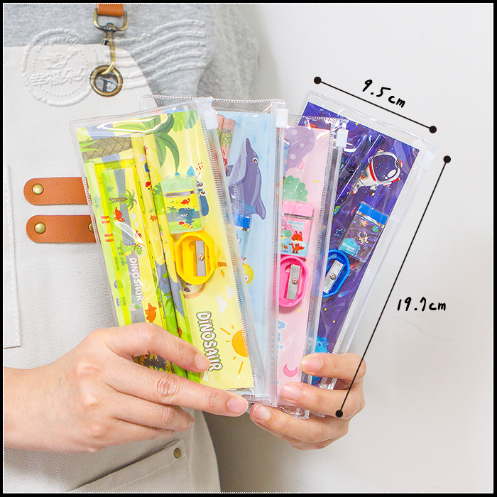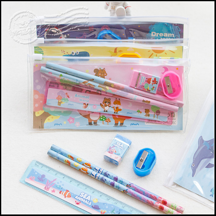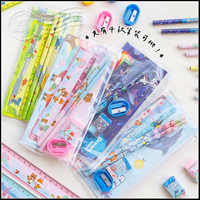 /// 產品特點 非常適合送給國小、幼稚園小朋友當開學禮物、畢業禮物、生日分享禮喔🥰 /// 商品介紹 每組筆袋均有:鉛筆*2支 + 15cm短尺*1支 + 削筆器*1個 + 橡皮擦1個 筆袋共有四款可挑: