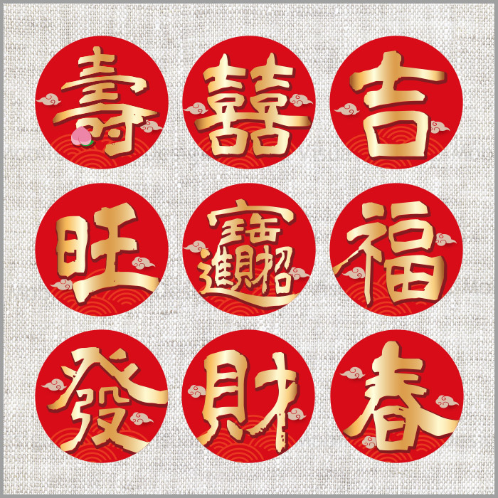 貼紙共有多款可挑:壽、囍、吉、旺、招財進寶、福、發、財、春