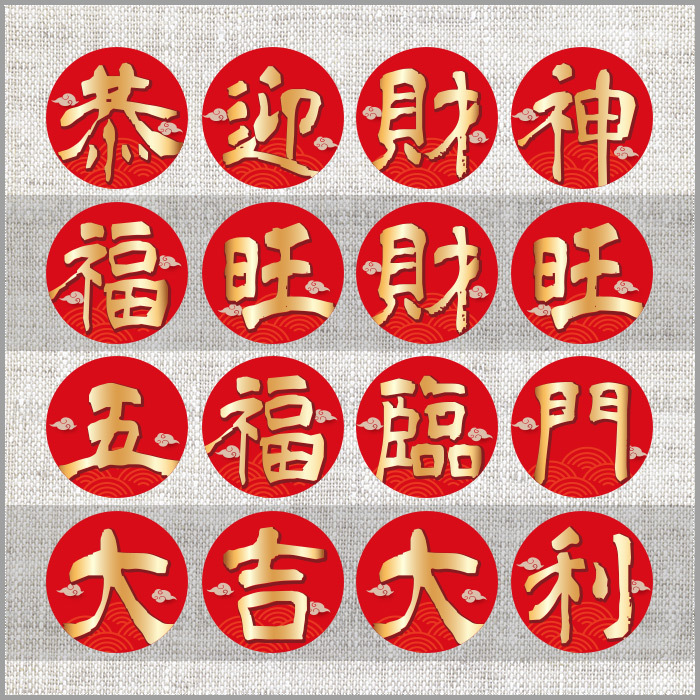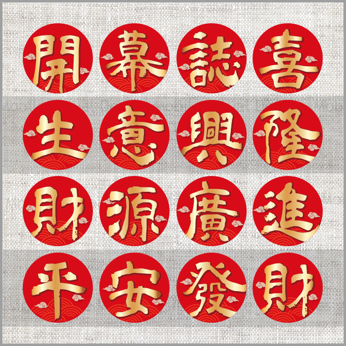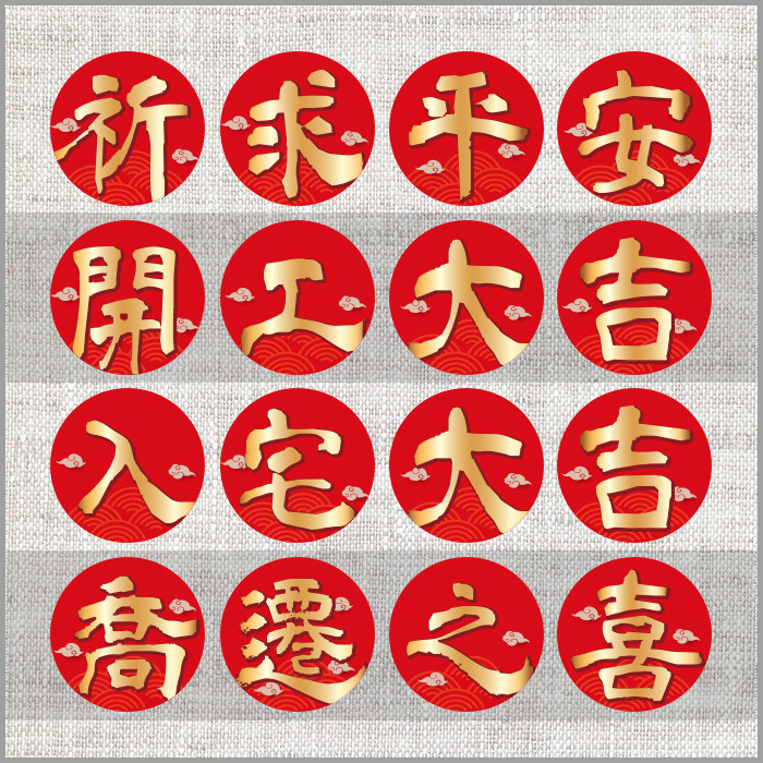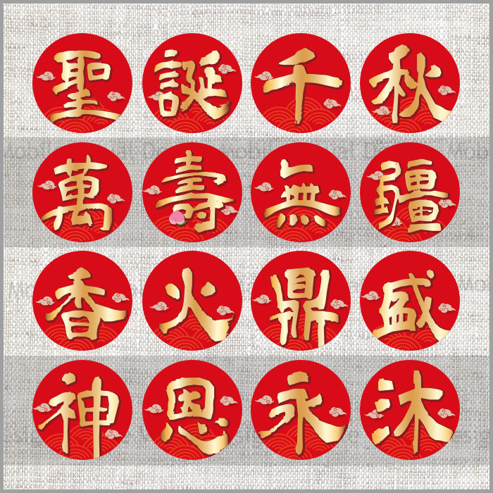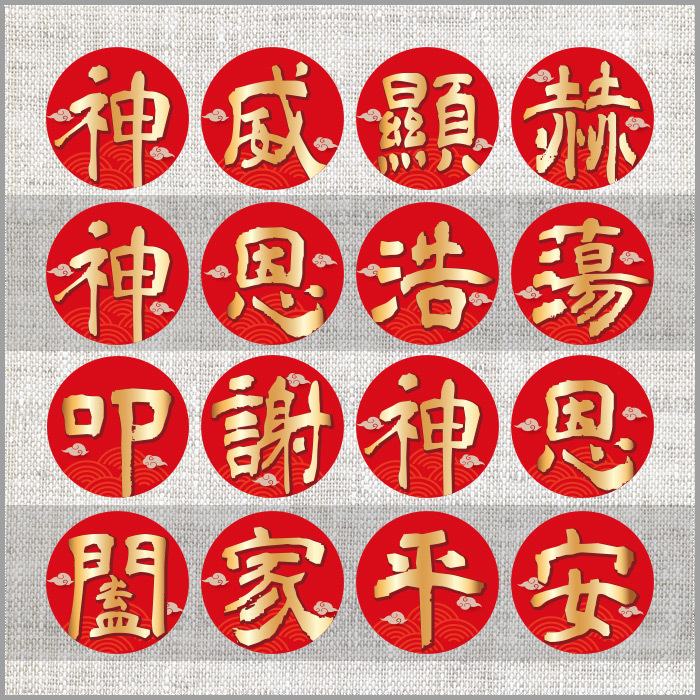 貼紙共有多款可挑: 聖誕千秋、萬壽無彊、香火鼎盛、神恩永沐、 神威顯赫、神恩浩蕩、叩謝神恩、闔家平安、 恭迎財神、福旺財旺、五福臨門、大吉大利、 祈求平安、開工大吉、入宅大吉、喬遷之喜、 開幕誌喜、生意興隆、財源廣進、平安發財、 業績長紅、金榜題名、囍結良緣、迎春納財