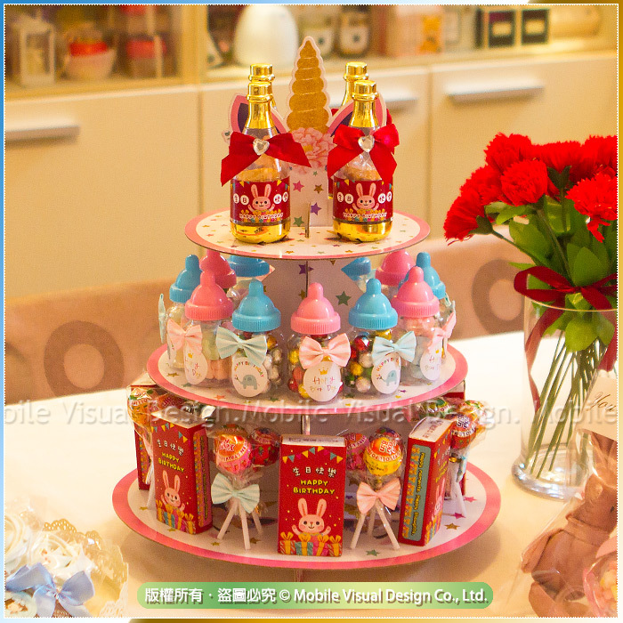 此組合內含: 獨角獸三層蛋糕架X1個(需自組) 生日快樂 香檳瓶 (小檸檬夾心餅乾 3個入)X4個 生日分享禮 小奶瓶糖果(七彩巧克力)X6個 生日分享禮 小奶瓶糖果(小花棉花糖)X6個 生日快樂 兔YOU 盒裝牛奶糖X7盒 (有包裝) 加倍佳棒棒糖(3支入 口味隨機)X7個