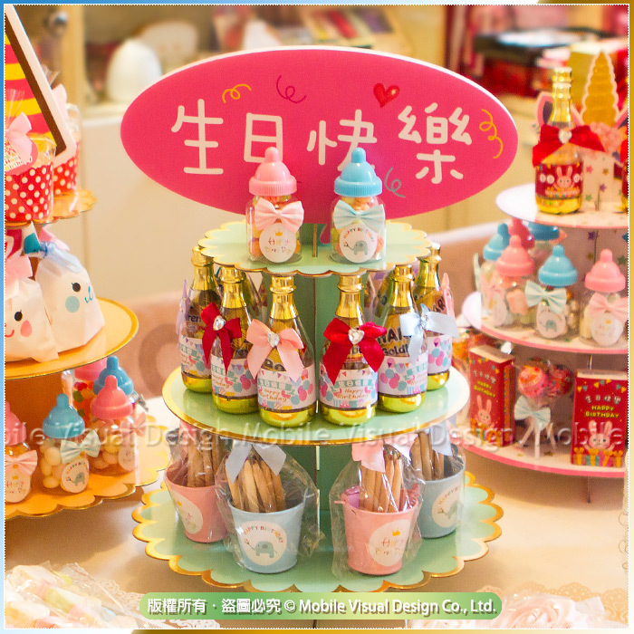 此組合內含: 單面生日快樂標主題板X1個(需自粘) 綠色花邊三層蛋糕架X1個(需自組) 生日分享禮 小奶瓶糖果(五彩球餅乾)X4個 生日快樂 金色香檳糖果瓶(德國小熊軟糖2小包)X10個 生日分享小禮物 「鐵桶裝」12色彩色鉛筆X8個