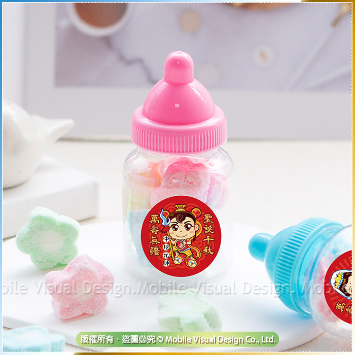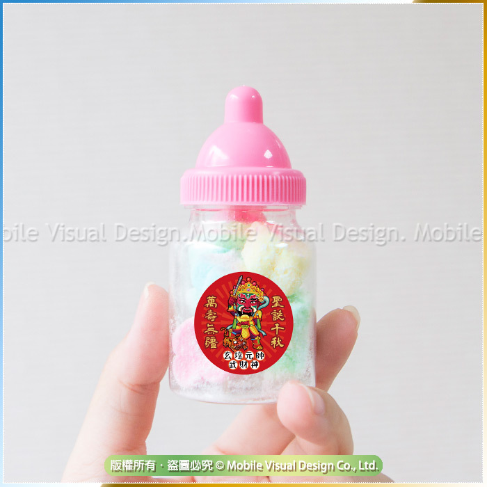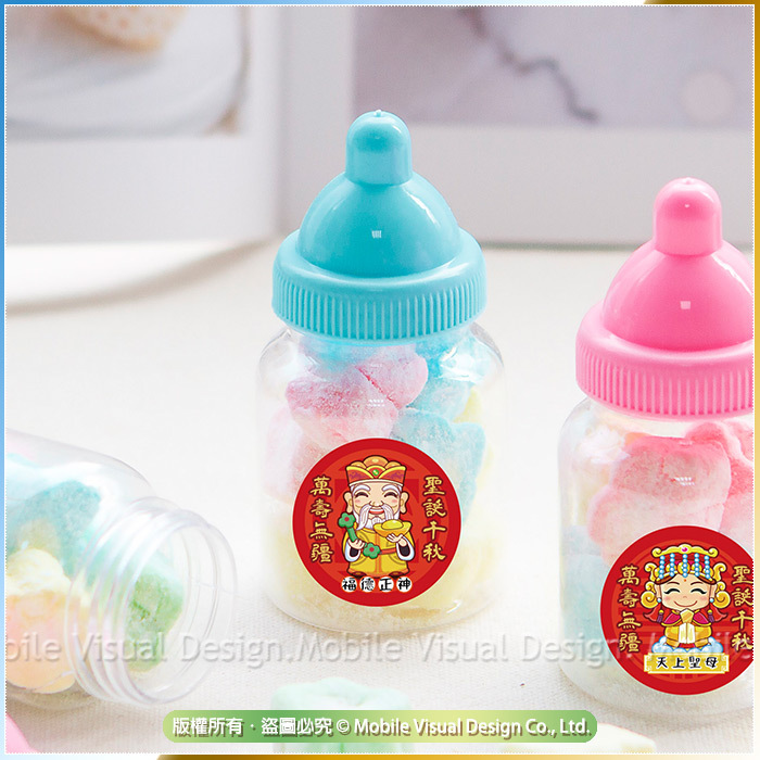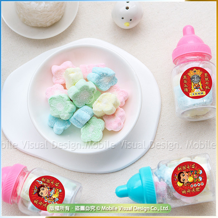超可愛小花造型棉花糖,口感綿綿甜甜的,吃起來甜在心頭😋 送客人送小朋友都好適合噢💖 可愛奶瓶瓶裝設計,小小瓶的, 放在辦公桌上有它陪伴,視覺都療癒了❤ 是不是讓生活增加了一點趣味呢~~ 糖果吃完還可以拿來續杯 (再來一客糖果) 或是裝其他喜歡的小物~~ 每罐奶瓶罐都會貼上幸福朵朵獨家電繪3cm Q版神明插圖貼紙唷! 超讚la👍 拿來供奉神明ㄏㄡ神明呷滴滴馬美賣唷! 或當結緣分享都超特別!! 奶嘴糖果共有2色:粉色、藍色