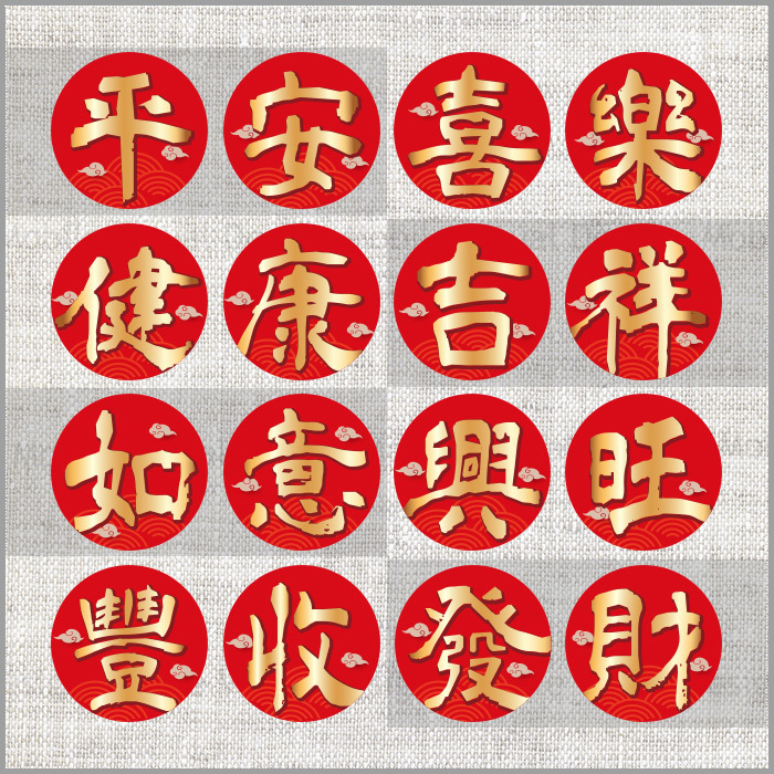 貼紙共有多款可挑: 平安、喜樂、健康、吉祥、 如意、興旺、豐收、發財
