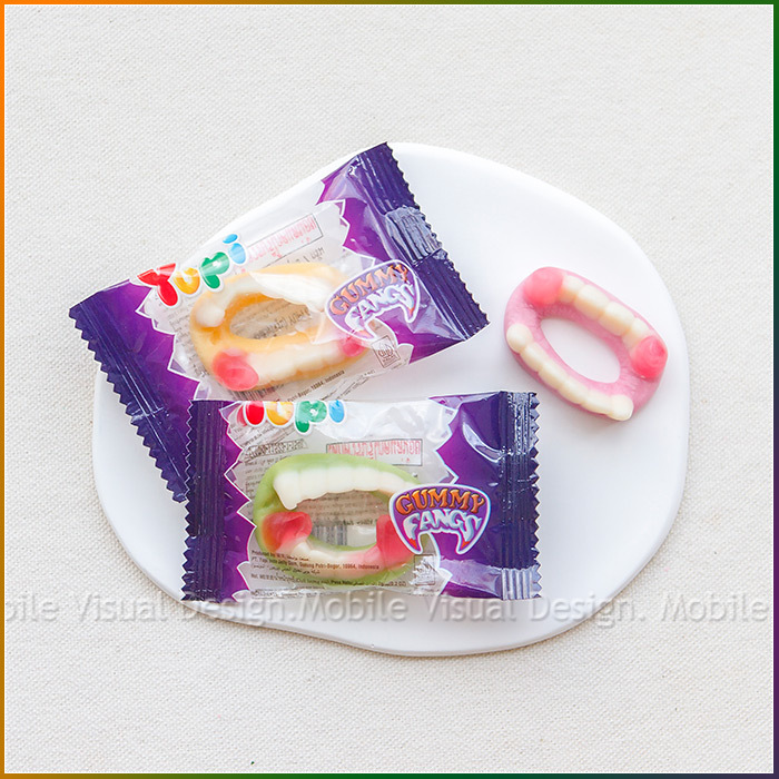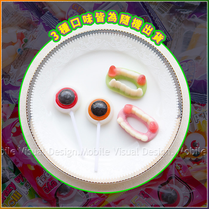 眼球棒棒糖每支約每支約2.8 x 7.5cm 大門牙軟糖每個約2.5 x 4cm 內容物手工測量,多少會有些微誤差喔! 不介意才下訂