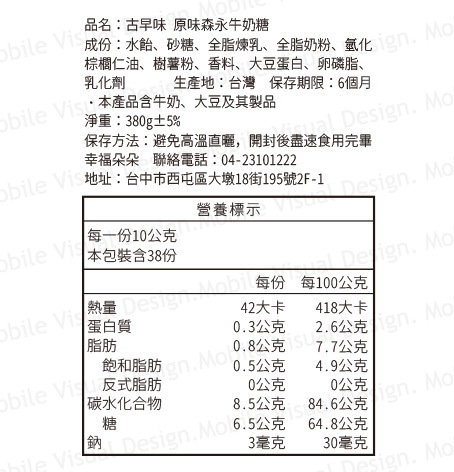 水飴、砂糖、全脂煉乳、全脂奶粉、氫化棕櫚仁油、樹薯粉、香料(含丙二醇、焦糖色素)、大豆蛋白、卵磷脂、乳化劑(脂肪酸山梨醇酐酯) .本產品含有牛奶、大豆及其製品。