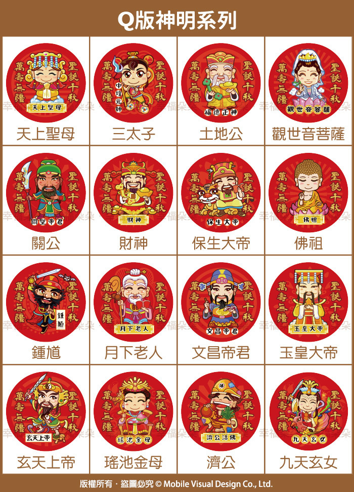 圓型的米香,象徵「圓滿如意」一口咬下去香氣四溢,鹹甜香融合一體,象徵好福氣😉 每份都貼有幸福朵朵獨家電繪4cm Q版神明插圖貼紙 ㊗Q版神明貼紙共55款可挑: 1.天上聖母(媽祖) 2.中壇元帥(三太子) 3.福德正神(土地公) 4.觀世音菩薩 5.關聖帝君(關公) 6.財神 7.保生大帝 8.佛祖 9.鍾馗 10.月下老人 11.文昌帝君 12.玉皇大帝 13.玄天上帝 14.瑤池金母(王母娘娘) 15.濟公活佛 16.九天玄女 17.萬善爺 18.城隍爺 19.廣澤尊王 20.地藏王菩薩 21.李府千歲 22.池府千歲 23.吳府千歲 24.朱府千歲 25.范府千歲 26.虎爺 27.神農大帝 28.三山國王 29.玄壇元帥-武財神 30.溫府千歲 31.邢府千歲 32.註生娘娘 33.魁星爺 34.聚寶尊王 35.齊天大聖 36.彌勒菩薩 37.清水祖師 38.開漳聖王 39.三官大帝-天官大帝 40.三官大帝-地官大帝 41.三官大帝-水官大帝 42.金龍太子 43.木吒太子 44.趙府千歲 45.東嶽大帝 46.驪山老母 47.盧府千歲 48.伽藍爺 49.七仙女娘娘 50.田都元帥 51.太陽星君 52.玉皇三公主 53.準提菩薩 54.王禪老祖