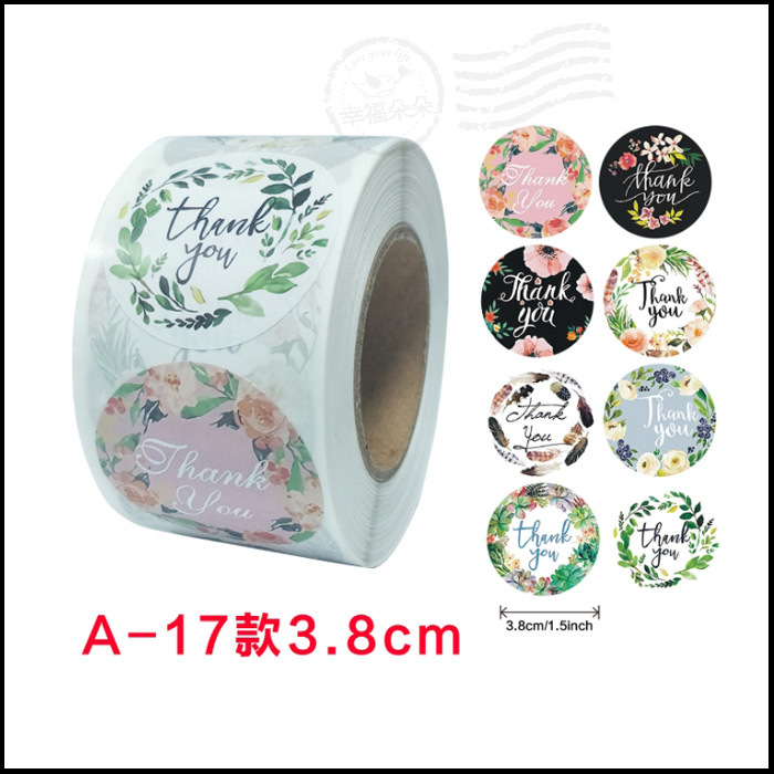 花草系列 thank you 圓形貼紙 3.8cm (1捲約500枚-混合8款圖案) A-17-38