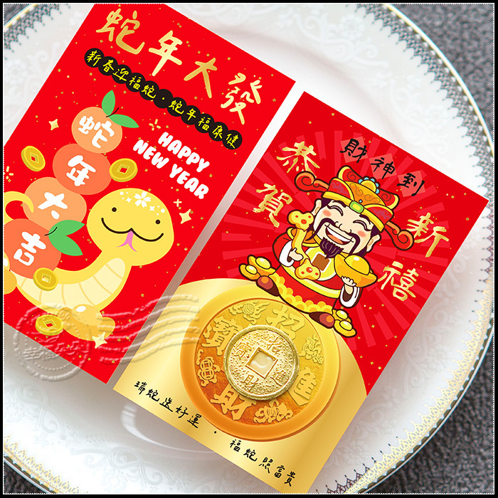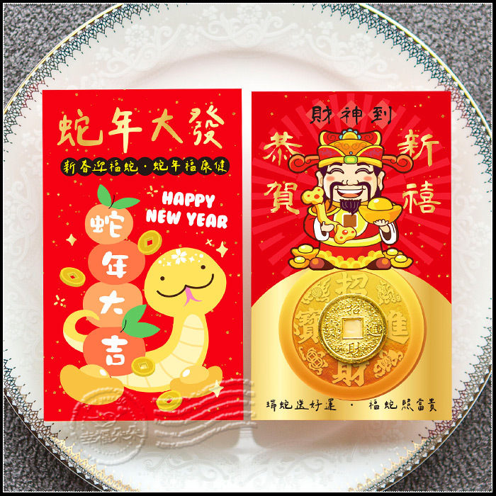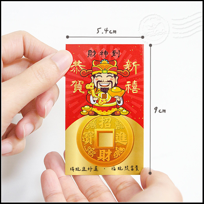 一面是福蛇發財,一面則是財神報喜, 兩面同時擁有,就是要讓您好運連連、發大財😘 每張皆貼有一個銅錢並附上opp袋包裝完成