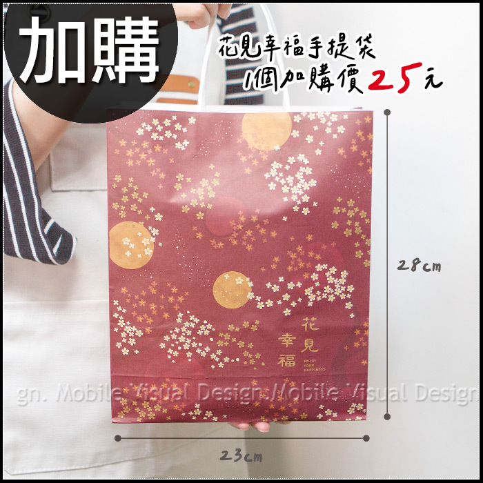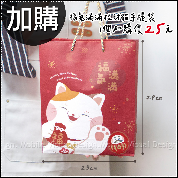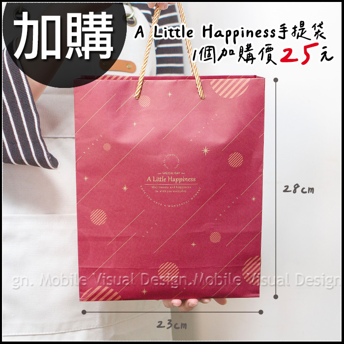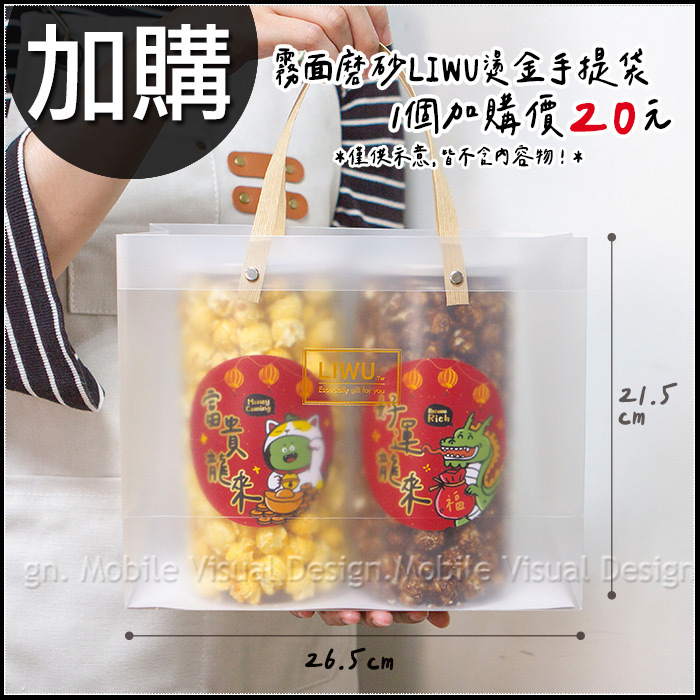 福氣滿滿招財貓手提袋1個加購價25元 花見幸福手提袋1個加購價25元 A Little Happiness手提袋1個加購價25元 霧面磨砂LIWU燙金手提袋1個加購價20元 ※注意:上述四款紙袋最多一袋只可裝入1至2罐爆米花罐※