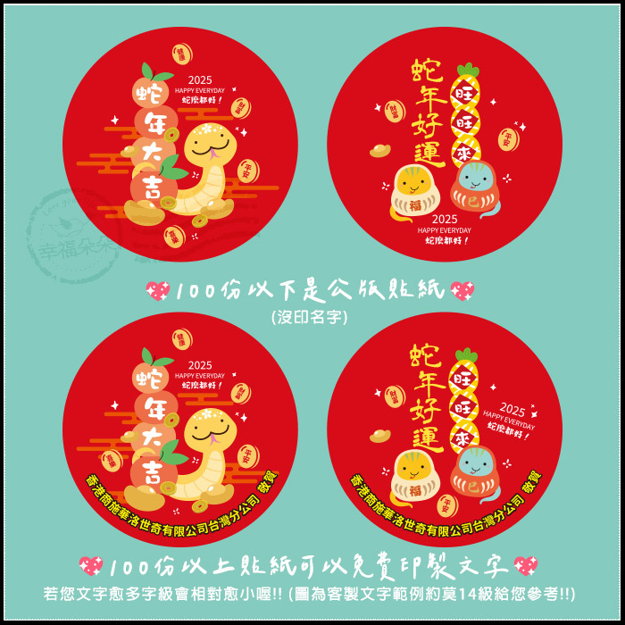*單筆訂購滿100罐以上可挑1款於貼紙上免費加印客製文字! *單筆訂購滿200罐以上可挑2款於貼紙上免費加印客製文字! *接單後,公版現貨約3天內交件,若是客製貼紙則約7-10天內交貨! ※訂購滿百份者若欲客製加印文字請詳閱以下注意事項↓↓↓ 1. 請務必記得要留言備註您的文字內容喔! 未備註者將以混2款「公版」出貨 !!! 2. 若您文字愈多字級會相對愈小喔!! (圖4客製文字約莫14級給您參考!!)