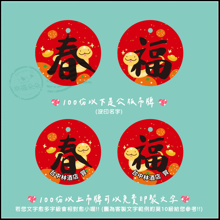 *單筆訂購滿100個以上可挑1款於吊牌上免費加印客製文字! *單筆訂購滿200個以上可挑2款於吊牌上免費加印客製文字! *接單後,公版現貨約3天內交件,若是客製吊牌則約7-10天內交貨! ※訂購滿百份者若欲客製加印文字請詳閱以下注意事項↓↓↓ 1. 請務必記得要留言備註您的文字內容喔! 未備註者將以混2款「公版」出貨 !!! 2. 若您文字愈多字級會相對愈小喔!! (圖5客製文字約莫10級給您參考!!)