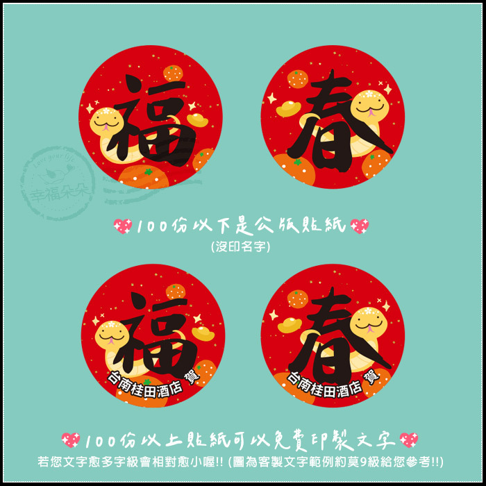 *單筆訂購滿100份以上可挑1款於貼紙上免費加印客製文字! *單筆訂購滿200份以上可挑2款於貼紙上免費加印客製文字! *接單後,公版現貨約3天內交件,若是客製貼紙則約7-10天內交貨! ※訂購滿百份者若欲客製加印文字請詳閱以下注意事項↓↓↓ 1. 請務必記得要留言備註您的文字內容喔! 未備註者將以混2款「公版」出貨 !!! 2. 若您文字愈多字級會相對愈小喔!! (圖7客製文字約莫9級給您參考!!) 🧡需提前3周以上預訂,請先留言使用日期及數量,確認後再下訂,謝謝您!! 採接單後新鮮現做於使用日期前2-3天交貨(趕件者請先詢問時間)