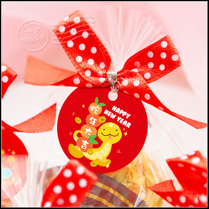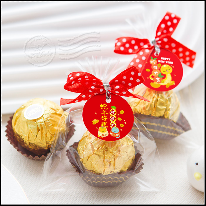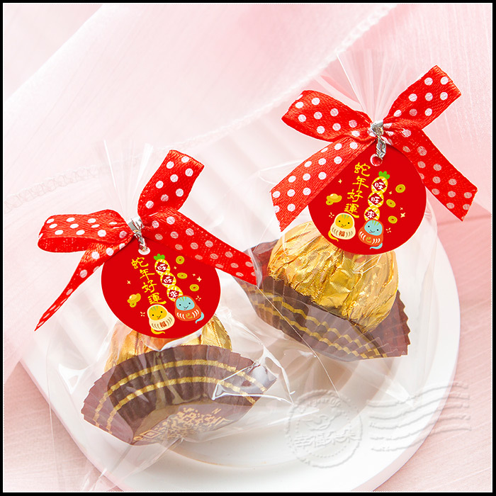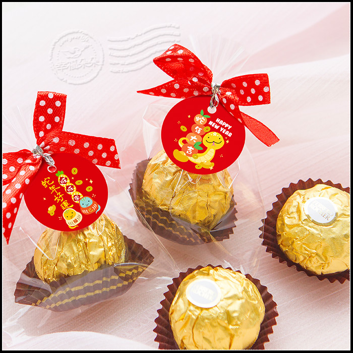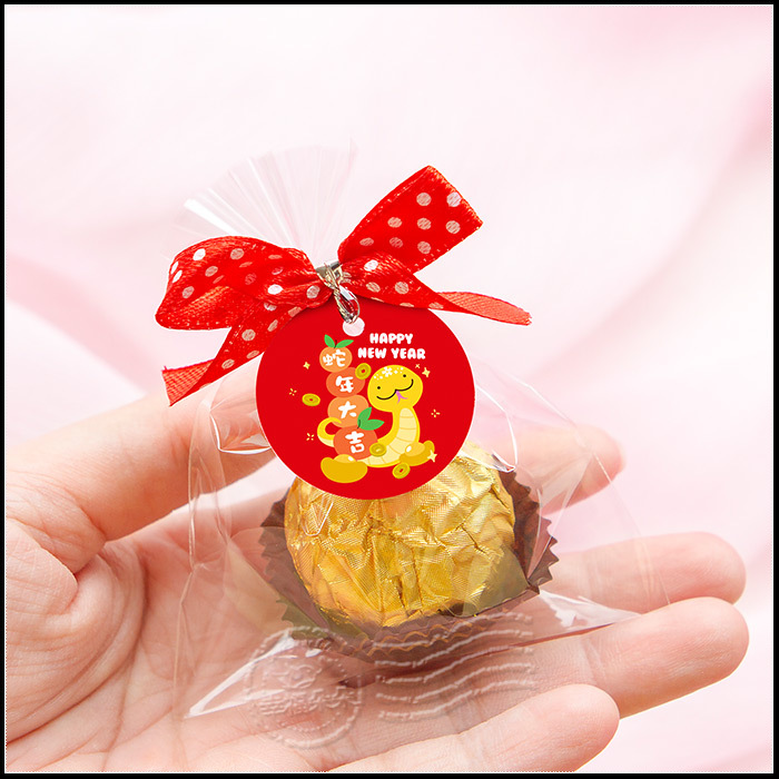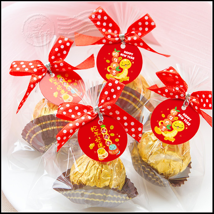 每份精巧包均有 金莎巧克力1顆入並會為您繫上水玉蝴蝶結及3cm圓形吊牌 共有2款可挑:蛇年大吉吊牌、蛇年好運吊牌🧡 作為節日送禮或迎賓糖果都絕對是超棒的禮物喔。 保存方式:存放於乾燥陰涼處即可 保存期限:至少半年以上