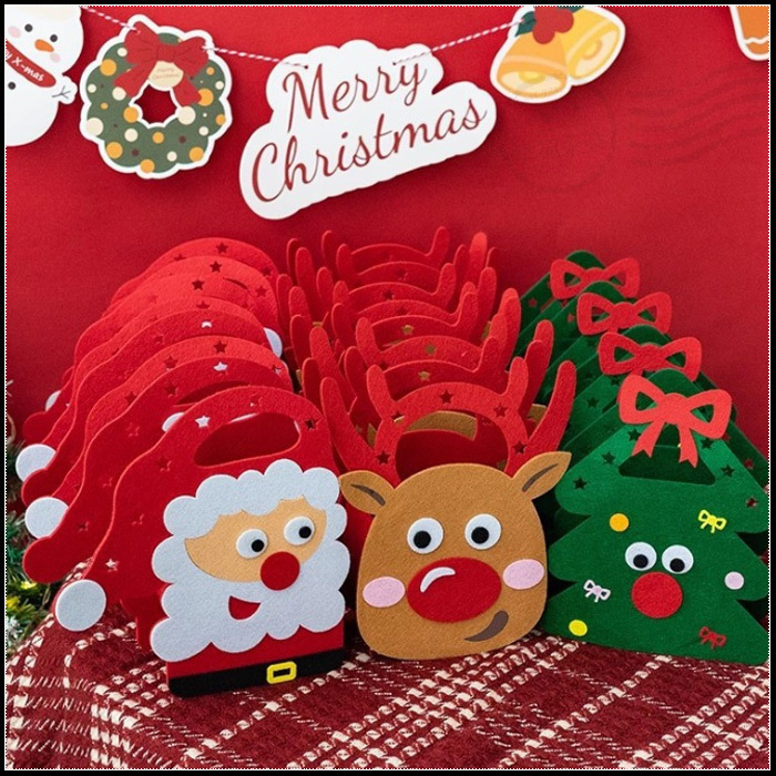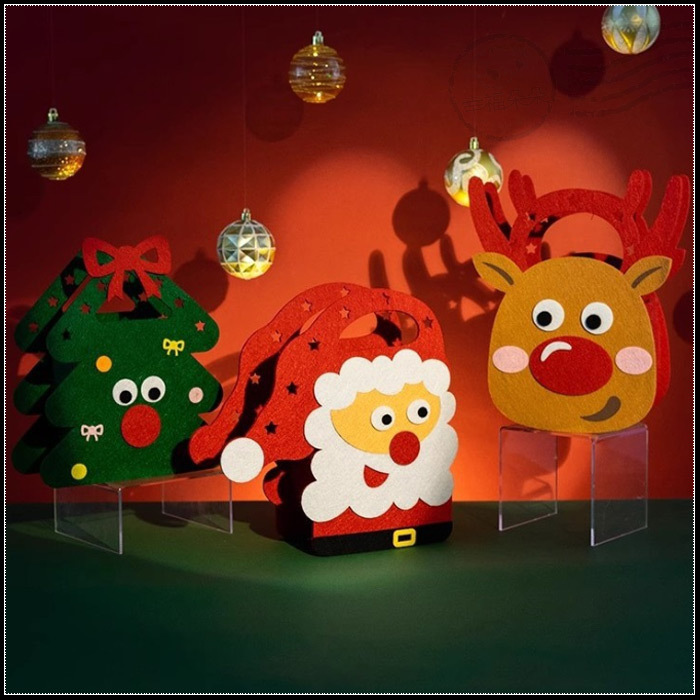 俏皮表情眼睛款的毛毡聖誕禮品袋,採用多層次手工粘貼,層次分明,更有立體感!! 有3款造型「聖誕老人」、「麋鹿」、「聖誕樹」 每款都好可愛喔!!! 大尺寸,可以包裝任何糖果、餅乾! 也可以放小禮物、小玩具、小飾品、商品...等等,當作聖誕禮物袋 非常有創意喔! 有手提把可以直接手提,攜帶方便喔!! 可站立,使用完還可當擺飾品、裝飾容器放一些信件等再利用喔!