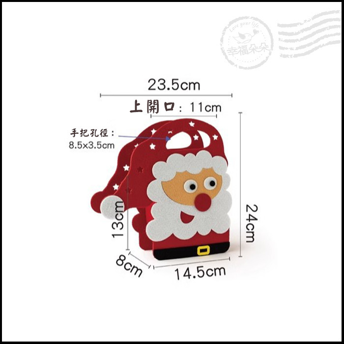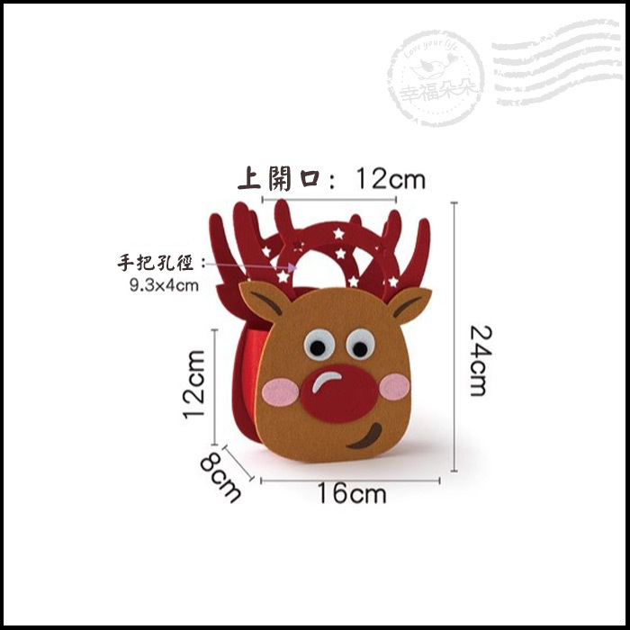 | 商品尺寸 | 聖誕老人款:約寬23.5cm(上開口11cm)X高13cm(含提把高24cm)X側厚度8cm 手把孔徑:8.5x3.5cm 麋鹿款:約寬16cm(上開口12cm)X高12cm(含提把高24cm)X側厚度8cm 手把孔徑:8.5x3.5cm