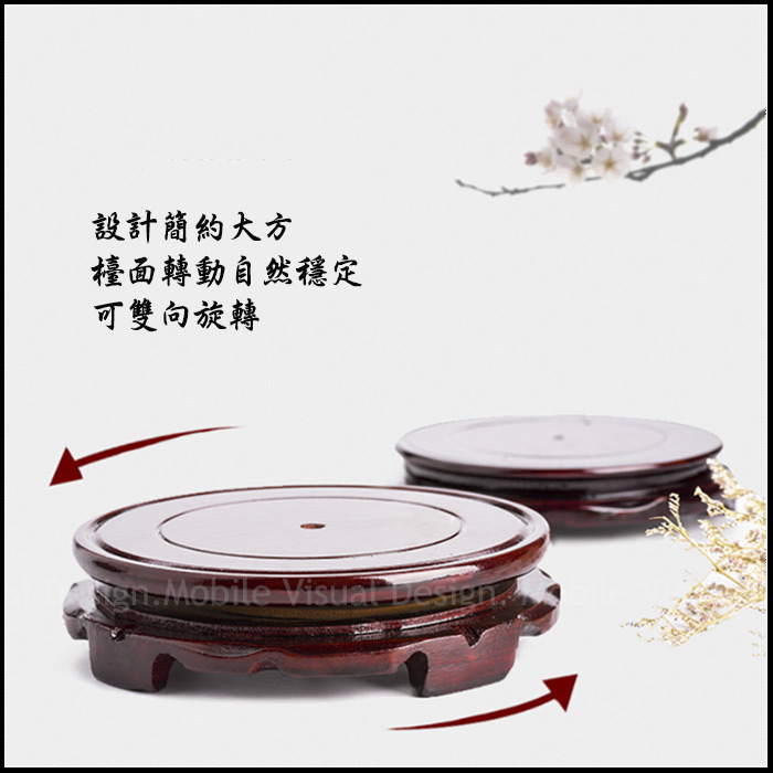 此旋轉底座,由高密度板製成 表面有做手工打磨和上漆 細緻光滑耐磨損 設計簡約大方,不失優雅 可雙向轉動,自然穩固! 可放置如聚寶盆、金元寶等招財擺飾 或是奇石、花瓶、佛像等藝術品 可360度旋轉 做全方位的展示 ★此項商品不含其他配件喔!
